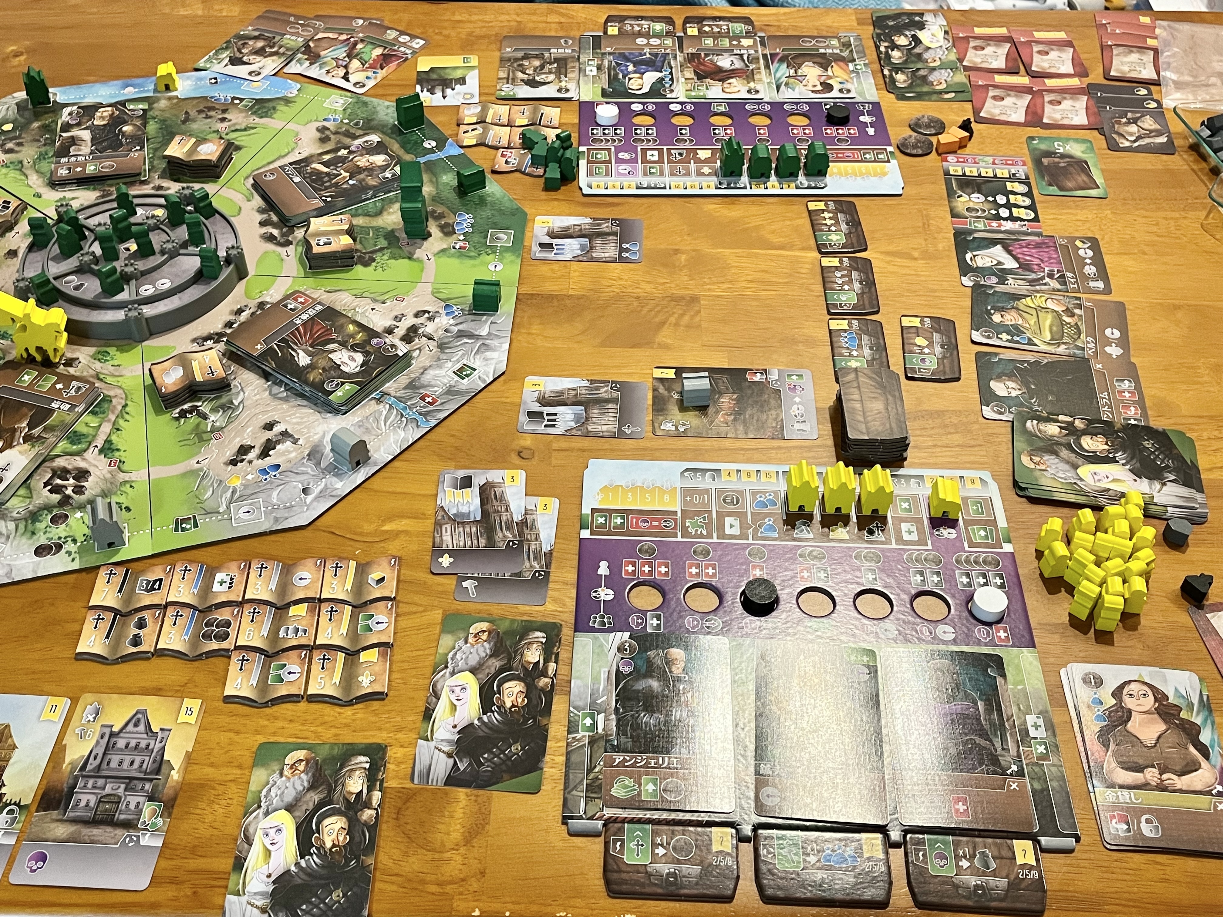 コンポーネントは新たに宝箱タイルが追加されたほか、公共建物カードとコマ、写本や町民など新ルールに則した新たなものがちょいちょい増えてて、準備してみるとすごくボリュームアップしたように見えます。