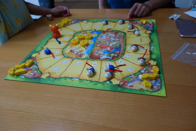 結局はサイコロの目次第だが、なんといってもネコが迫ってくる間合いが読めず、先に退避するかリスクをとって大きなチーズを目指すか、盛り上がりながら選択を迫られる。(写真:子どもの青ネズミチーム大量リードの図)