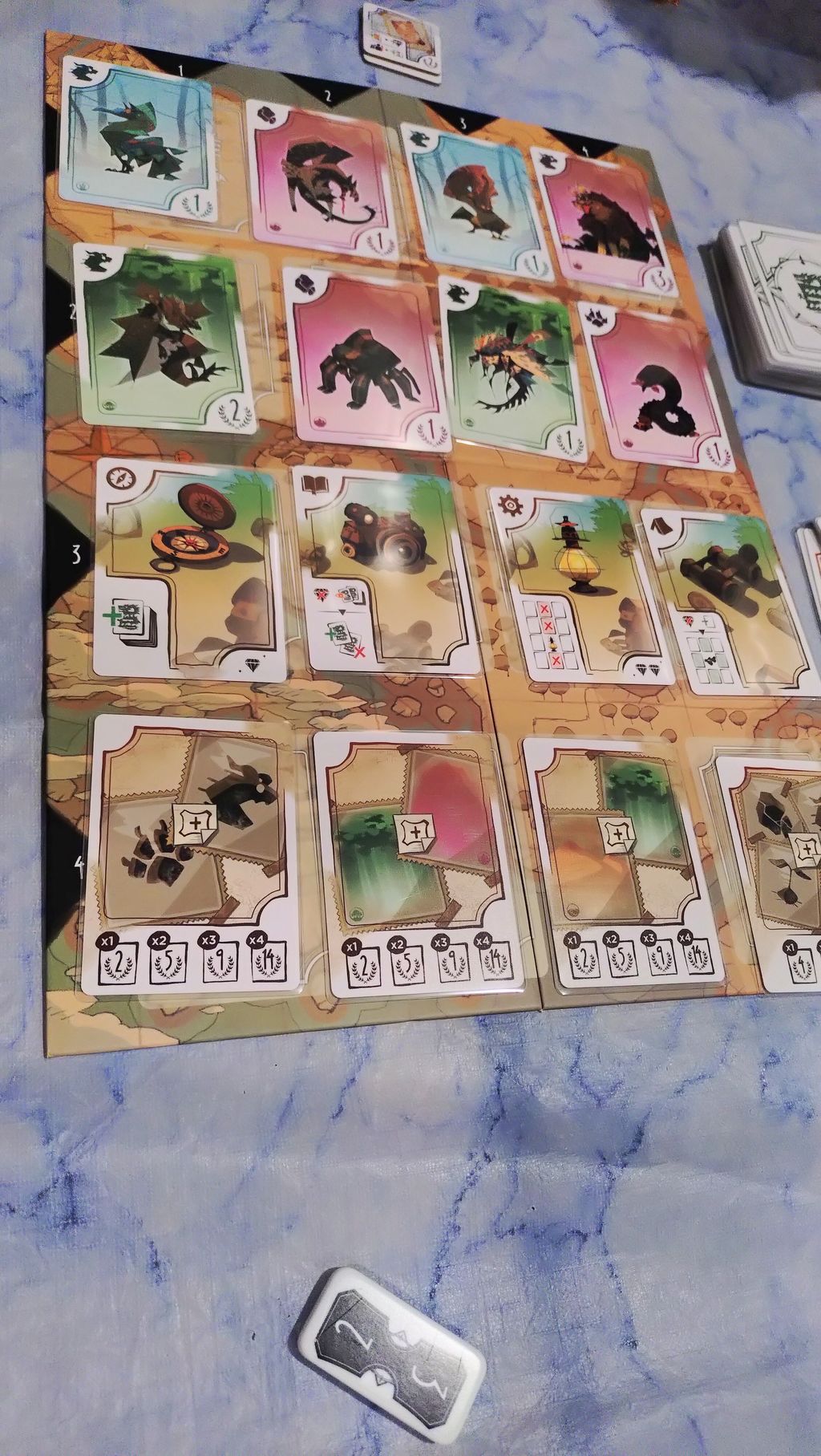 ぱっと見、よくあるセットコレクションで、変わった動物を捕獲していくのですが、手持ちのドミノ2つ内、1つ場に捨てて、場のドミノを手に入れて、書かれた数字が交差する場所のカードを取れます。なので、欲しいカードが取れないという事もあります。