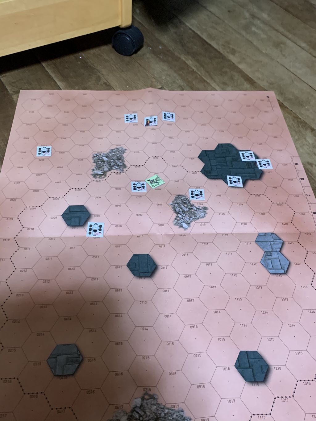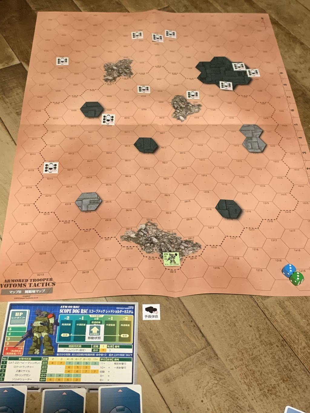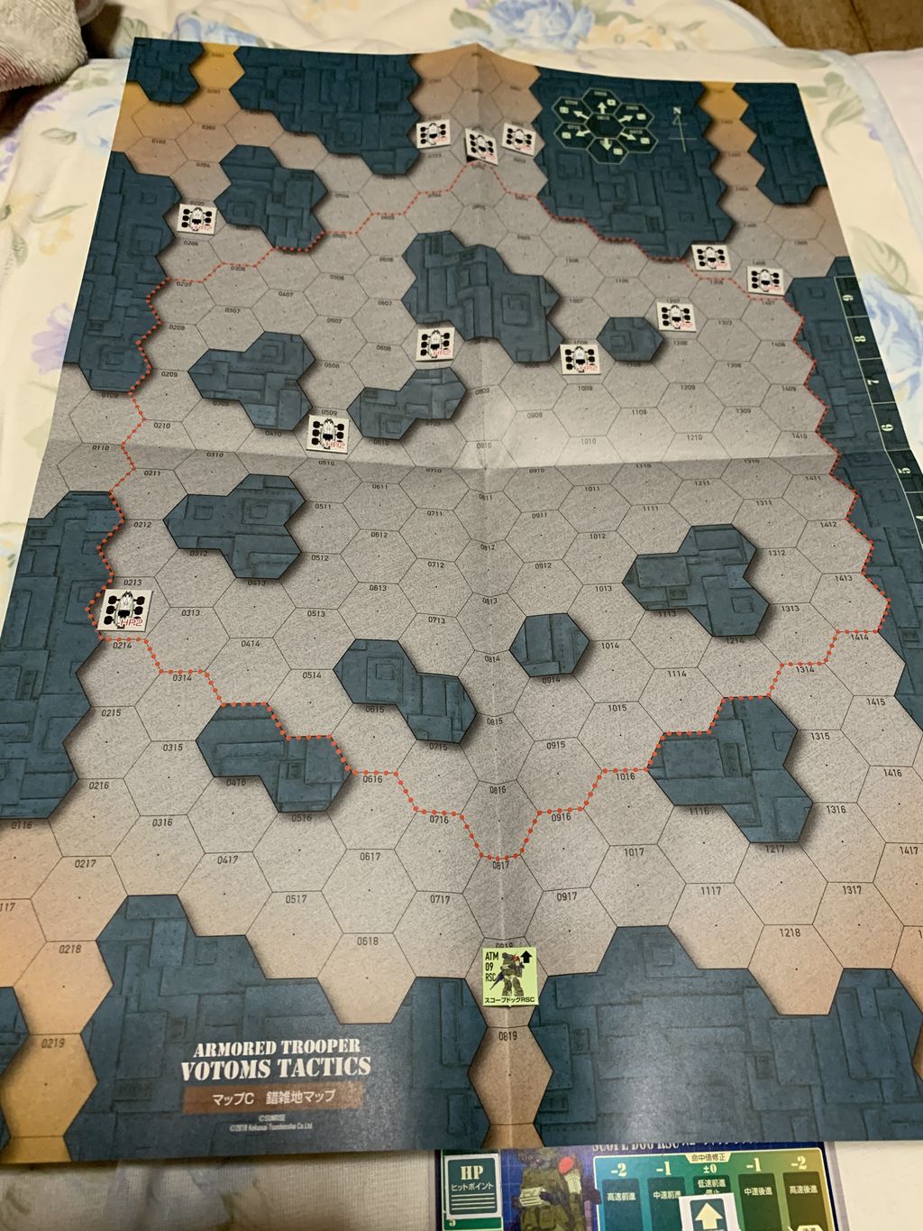 二回目の練習でも2台撃破したものの、やはり負けてしまい、おかしいなぁとルールブックを見直してみたら使用するマップが違いました。こちらが正しいマップです。失礼しました。ちなみに正しいマップでの練習でも2台撃破、1台損傷までがやっとでした。もっと考えてプレイしないと勝てませんね。