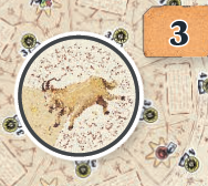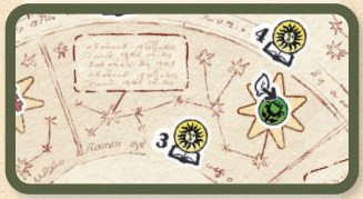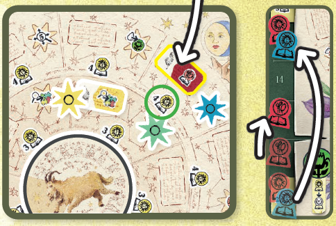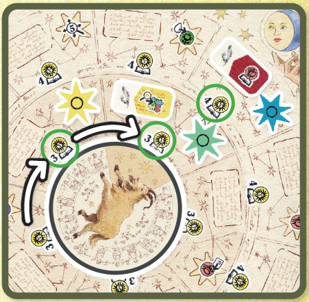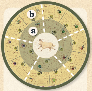 3) ヤギディスクをボード上の専用スペースに置き、その暗い部分をランダムに選択された 5つの占星術セクターの1つに合わせます。