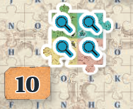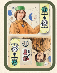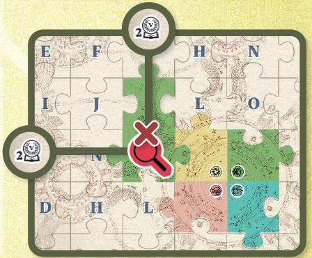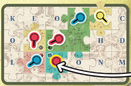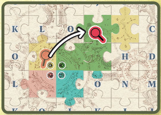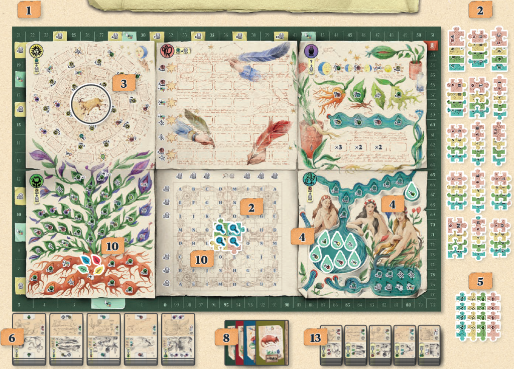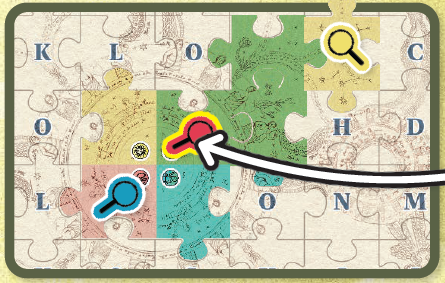 7) 2人用ゲームでは、各タイプの中立プレイヤーカード1枚をランダムに取り、指示に従ってボードにトークンを配置して、中立プレイヤーをシミュレートします。また、示されているパズルピースをボードのパズルエリアに配置します。テキストは、翻訳されていない面を上にしてランダムに配置されます。3人用ゲームでも同じことを行いますが、植物学と占星術のセクションでのみ行います。