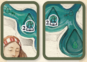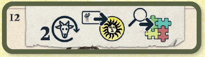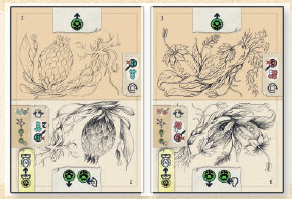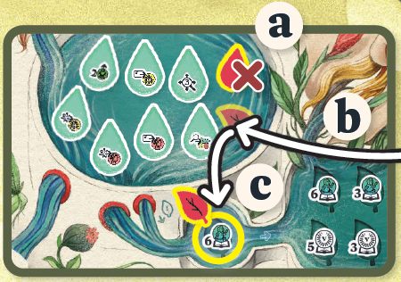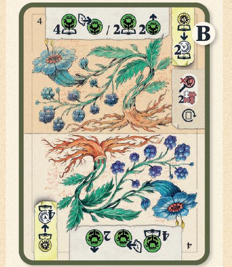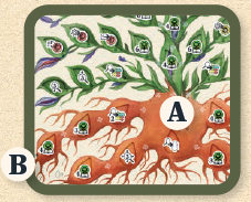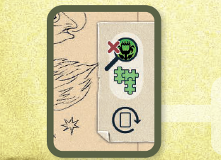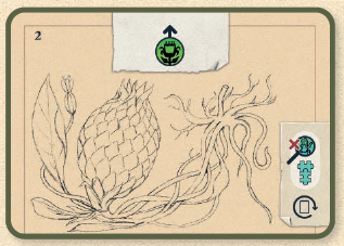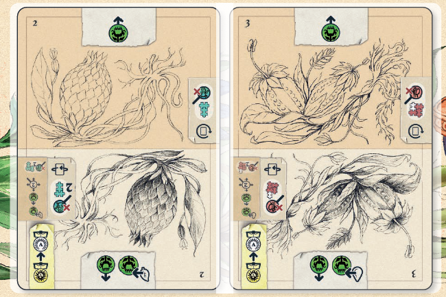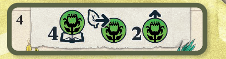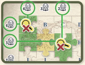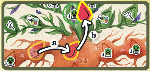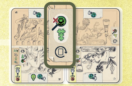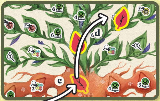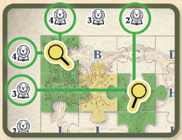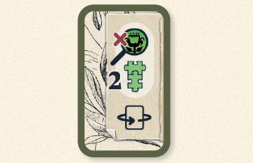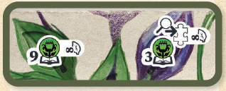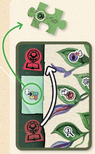 進行条件の例(a): この条件により、植物学パズルピース2枚以上のグループにある研究トークンを2つ取り除く必要がある場合、それらは2つの異なるグループから取る必要があります。 |