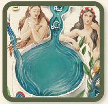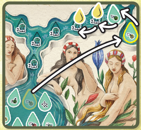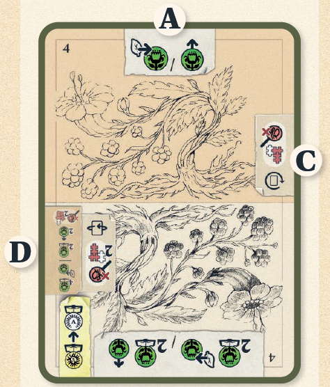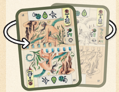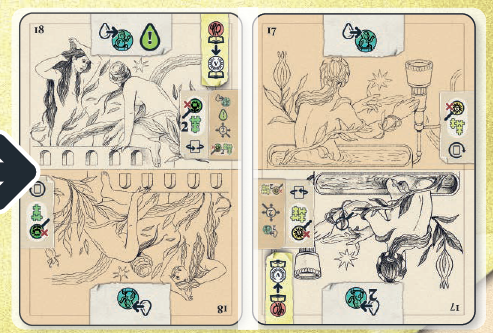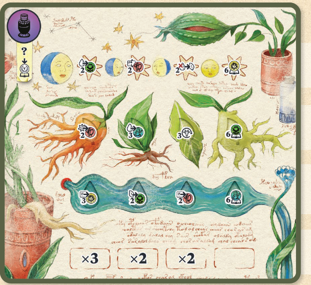 あなたのターンで、本の任意のダブルページを選択し、それらのページ (カード) の 1 つの上半分でアクションを実行します。各ページのペアでは、手稿の 5 つの主要セクション (植物学、占星術、浴場、執筆、レシピ) のいずれかを操作できます。