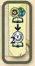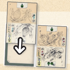 9) ヴォイニッチデッキから配られたすべてのカードを本に入れます。このとき、そのうちの1枚ずつを各スリーブに配置して、すべてのカードが最初のステップ(イラストの完成度が最も低い方)が上部に表示されるようにします。それらは、本の最初のページから始めて、植物学、占星術、浴場、執筆、レシピの順序で配置する必要があります。本の作成が終わると、本の各見開きのダブルページに同じデッキからの2枚のカードが並び、すべて最初のステップが上部になっています。
