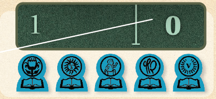 11) 5つの知識マーカー (植物学、占星術、浴場、執筆、総合知識) をメインボードのスコアトラックの「0」スポットに配置します。 |