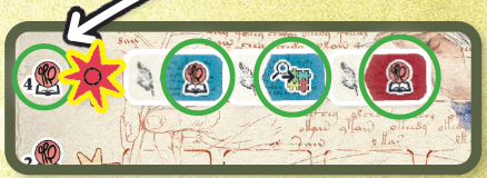 ターンの開始時に、クララ(赤)は、このターンのために開いたページの1つを進めることにしました。進行条件では、隣接する植物学ピースが少なくとも2つ含まれているグループに自分の研究トークンを置いている必要があります。 |