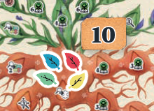 10) メインボードの植物学セクションの葉の開始位置にあなたの葉を1つ置き、中央パズルピースの各スペースにあなたの研究トークンを1つずつ配置します。