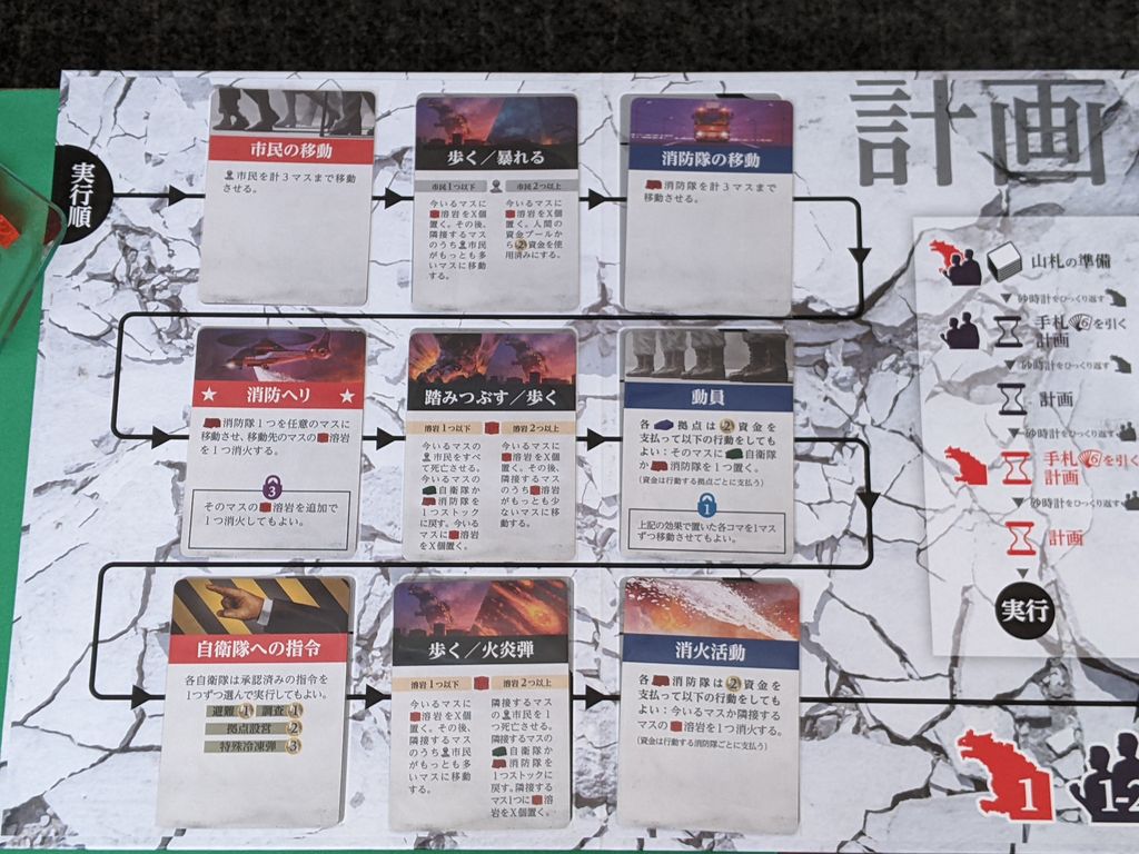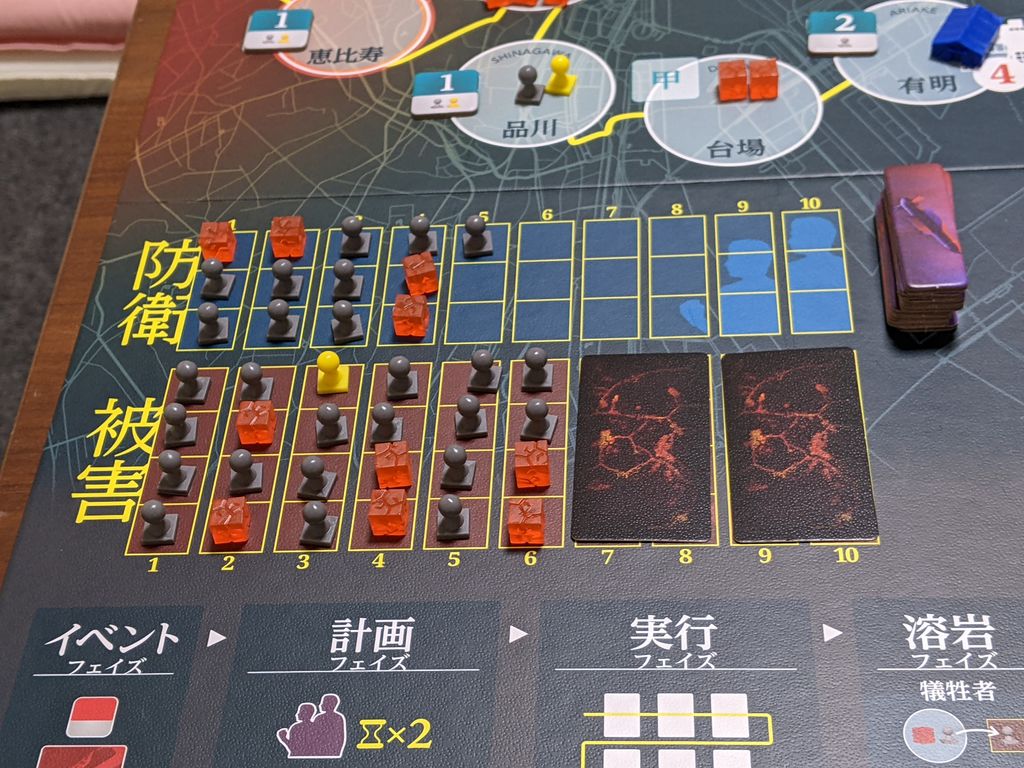 防衛トラックとか被害トラックとか直接的な表現だが、結局は市民、溶岩=点数だ。点数を積み重ねてカードをマネジメントするゲームと言う事が分かった。