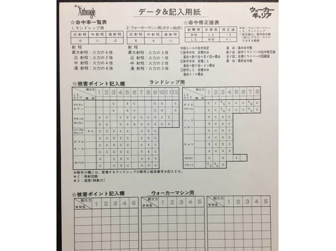 機体ごと、艦ごとにマス目を消してゆくなら、それを利用して特徴を出そうというのです。例えばランドシップなら、艦種によって記録用紙のマス目に「C」とか「S」とかの文字が書いてあって、そのマス目がつぶれると、なんと性能が変わるのです!!「C」がつぶれると、攻撃できる回数が減少します(主砲や機銃が破壊された、という感じですね)。また「S」マークが消えると、そのぶんだけ移動力が減少します(エンジンの出力が上がらなくなる、という感じですね)。艦種によってこれでダメージコントロール性能の違いを表現したりできます。ウォーカーマシンは統一で、2マスごとに「S」マークのみをあらかじめ記入しておくルールで、これによって脚部の損傷などで展開速度が減少してしまったりするのです。