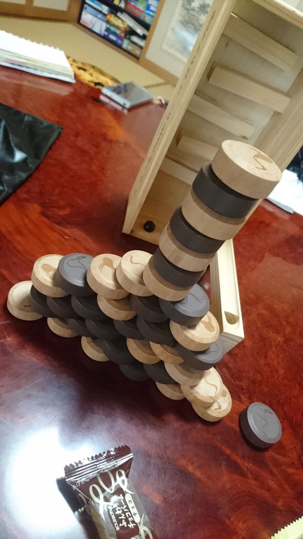 ルールは簡単、白と黒に別れて袋ツモで交互に木ゴマを置いて8段のピラミッド作り、完成したら交互にピラミッドから自分の色を引き抜いてピラミッドの最上段に積み上げてタワーを作る。タワーを崩したら負け。ピラミッドはなんぼ崩してもOKなのがミソ。
