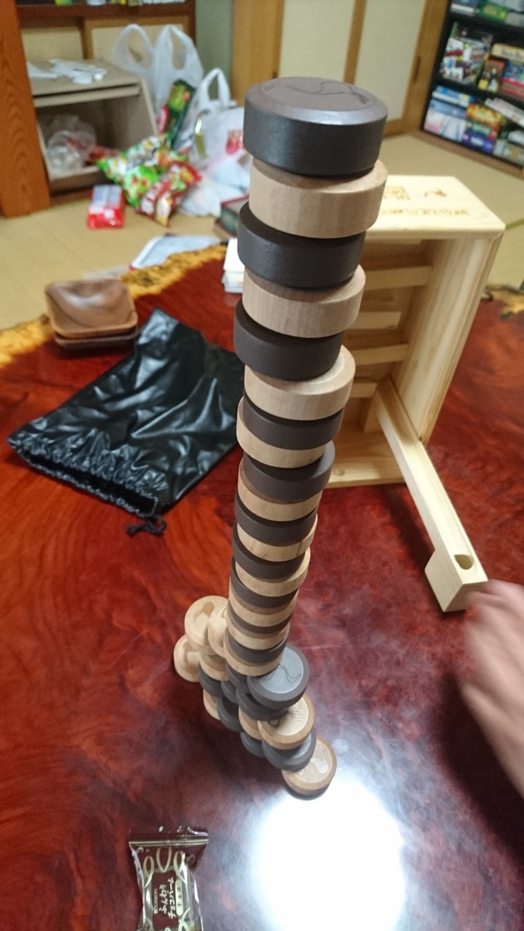 具体的にはこんな感じ。見た目は簡単に崩れそうだけども意外と木駒が食いついて簡単には崩れない。奥のがワラモッピーの箱兼タイマーでビー玉を上から転がしてピタゴラ的なノリで落ちていく。落ちきる前にタワーにコマを積めばオッケー。積めなきゃ負け。ちなみに私は黒であり、写真を見ると黒が真ん中にとても寄っている。どっちが負けたかは予想がつくだろうし、予想通りの結果になった。