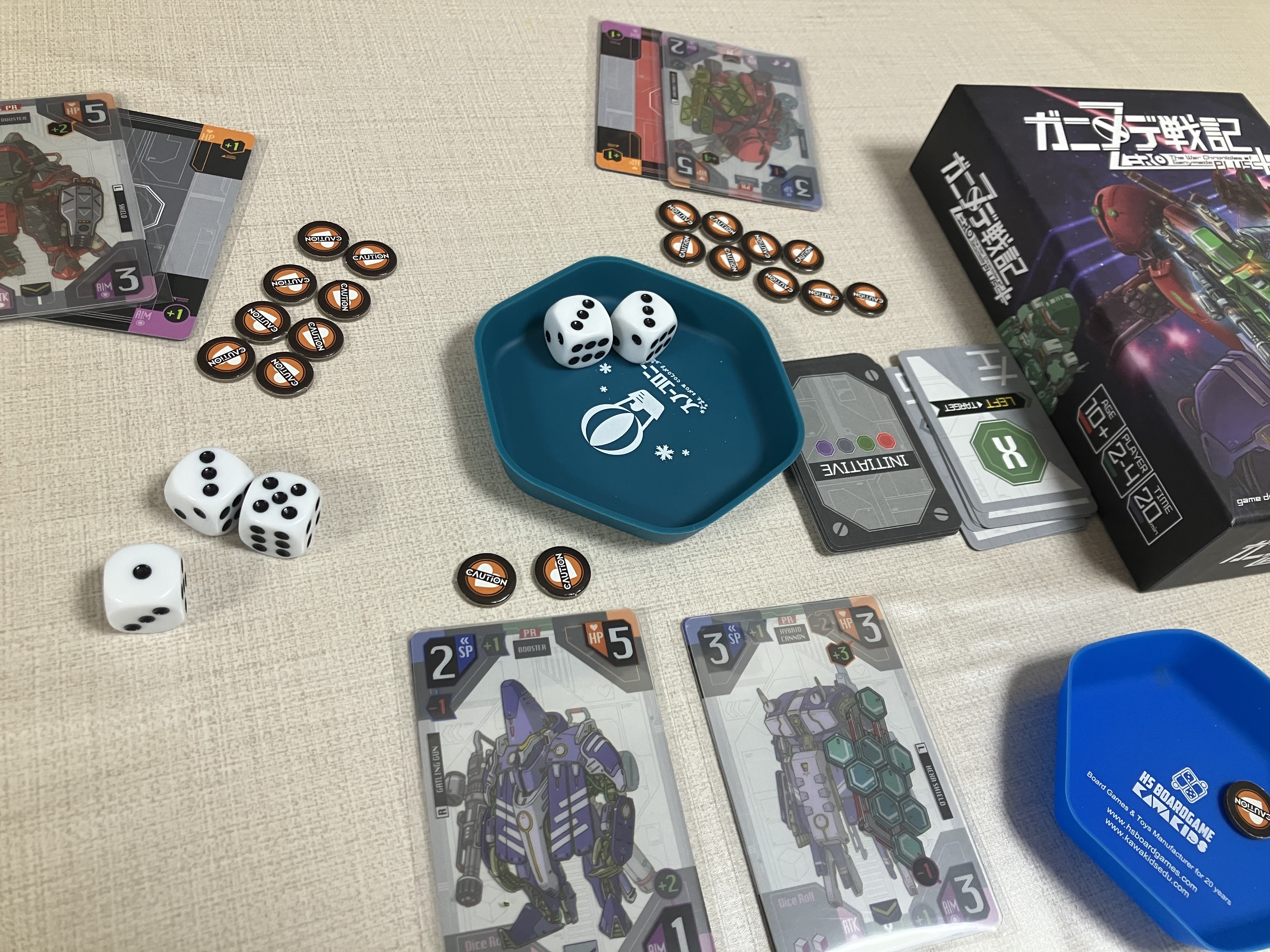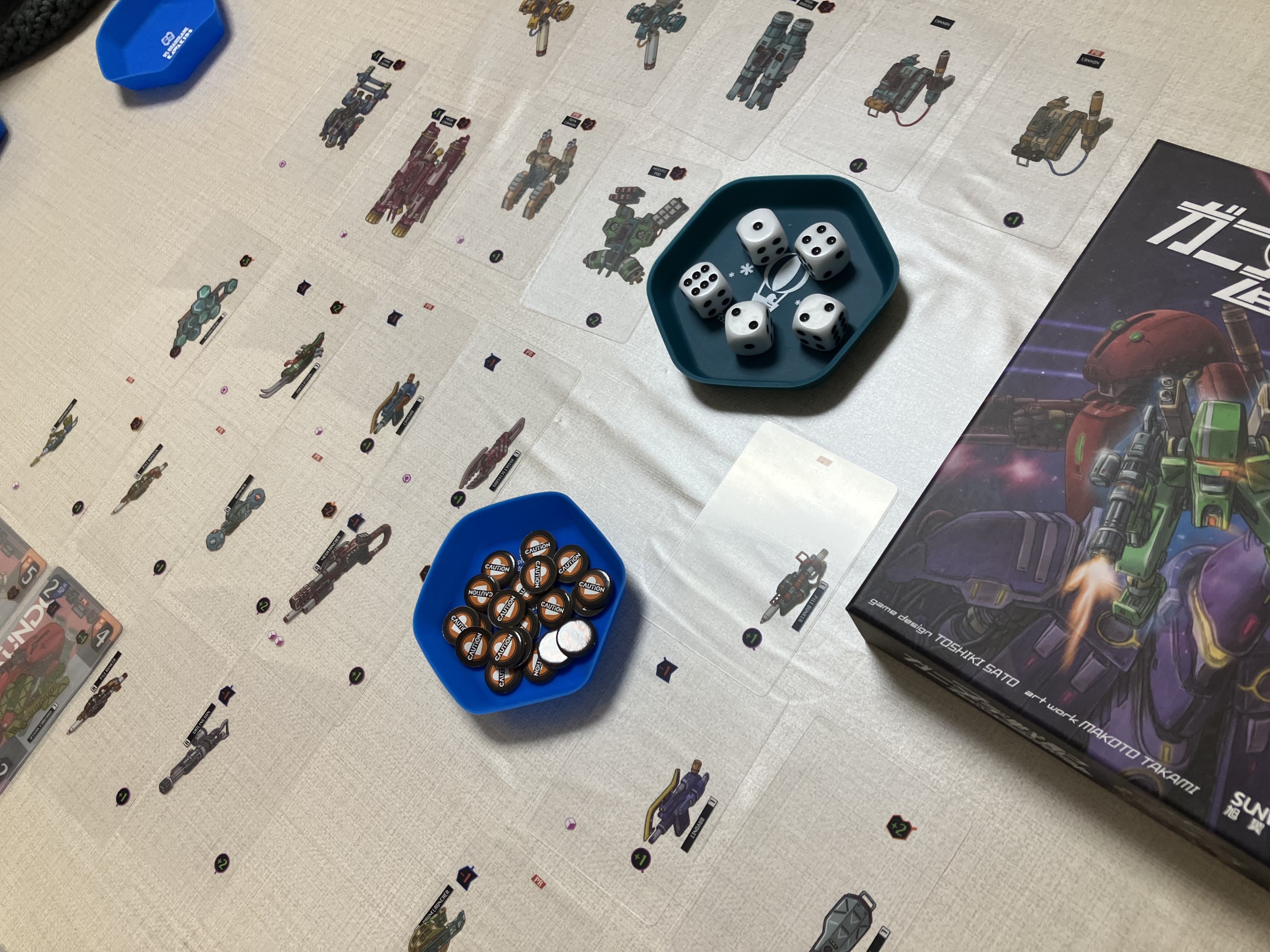 強化パーツカードをオープンドラフトする際、全部のパーツカードをテーブルに広げる様は圧巻なのですが、枚数が多いためスペースも取り、選択に時間がかかりました。この時間もまた楽しいのですがw