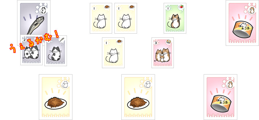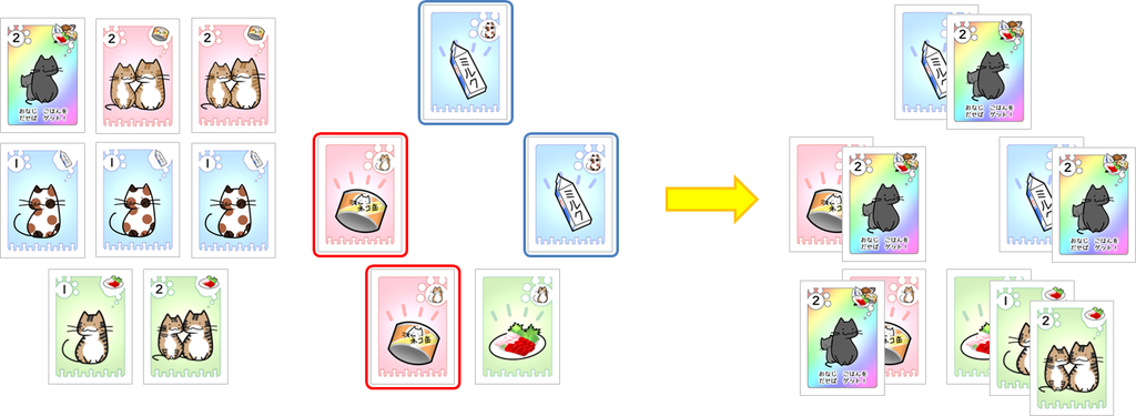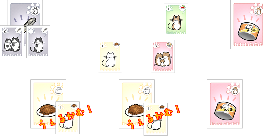 にゃんこカードの獲得は、他プレイヤーと同じごはんカードを出したかどうかで決まります。