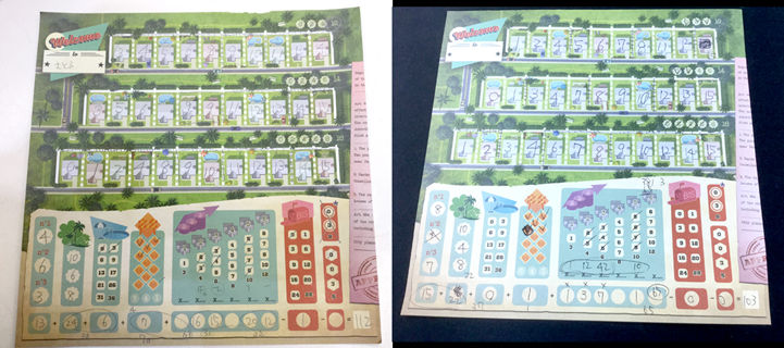カード、シートの視認性が悪い。鉛筆で普通に線を引くだけだと引いたのか引いてないのか判りづらい。カードのアイコン面は支障ないが、数字面は正直……うーん。誤認するほどではないが、ごちゃごちゃしてて見やすいとは言えない。もうちょっと建物の周りのイラストの色を淡くするか、道の白線を太くする(最低今の2倍)かしないと書いた線がさっぱり見えない。これ、デザインの敗北案件では?
