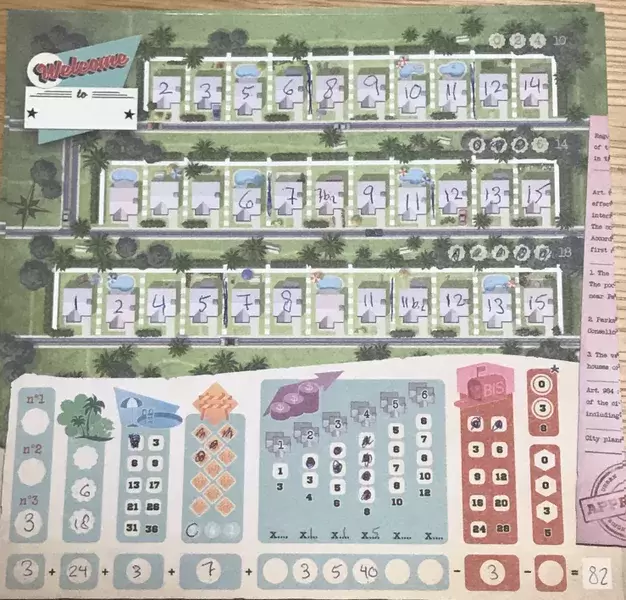 このゲームでは住宅地の開発と区画分け、公園やプールなどの設備の設置など様々なことが行えます。それらをカードの指示に従い、専用シートに記入していきます。