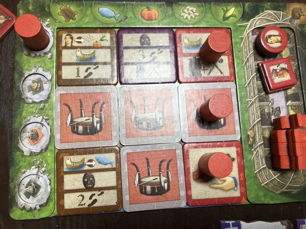 つまり、移動したり資源を集めたりしてから上記のアクションを打つことで得点することができるので、4種類の得点バランスを気にしつつ、永続効果をうまくシナジーさせる方法を探したり、周りのプレイヤーと戦略がかぶらないように動いたりしつつ、得点を稼いでいきます。