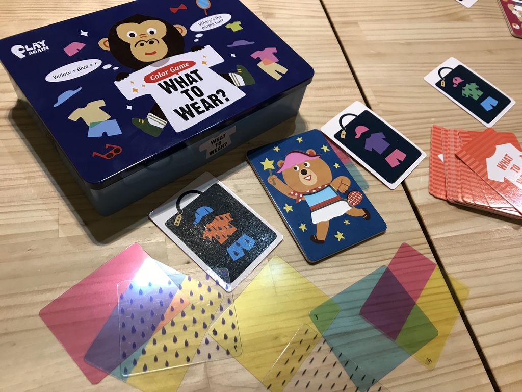 フィルムの色は3原色(赤・青・黄)ですので、2枚の色をかぶせて紫・オレンジ・緑にするお題カードもあります。さらに模様をつける場合があります。