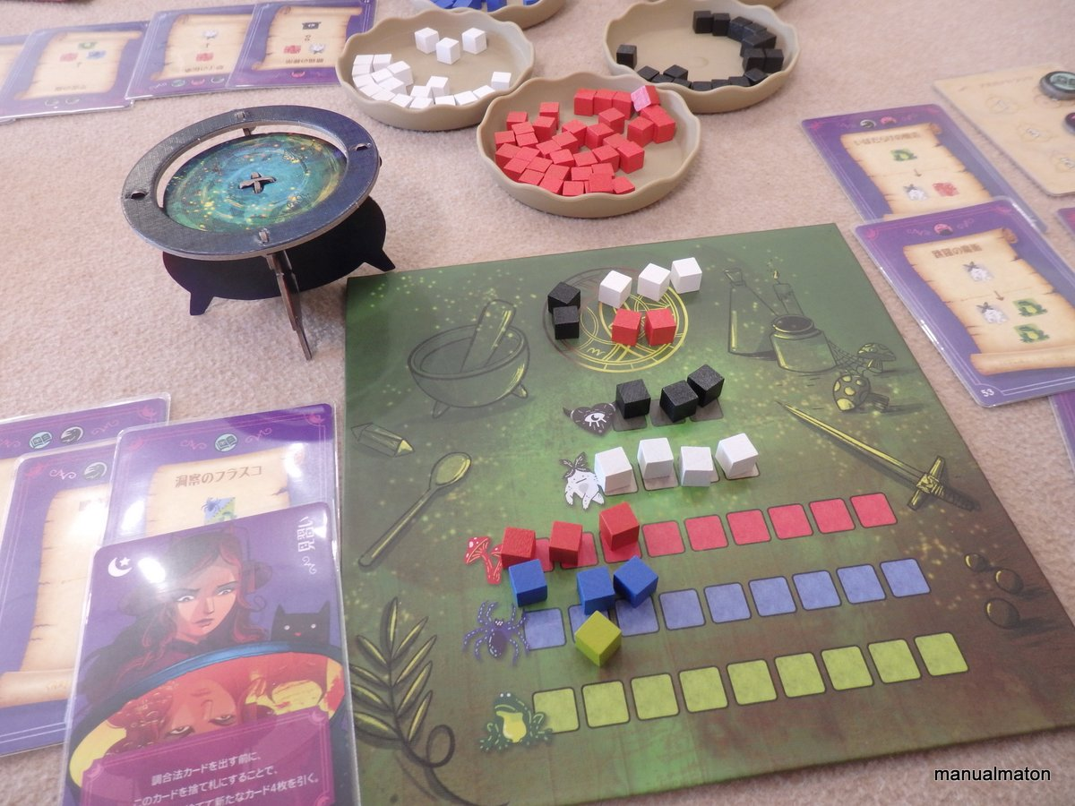 まず目を引くのが、その豪華なコンポーネントです。立体的な釜や独特のカードイラストは、まるで本当に魔女になって薬を調合しているかのような没入感を味わえます。