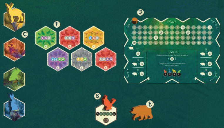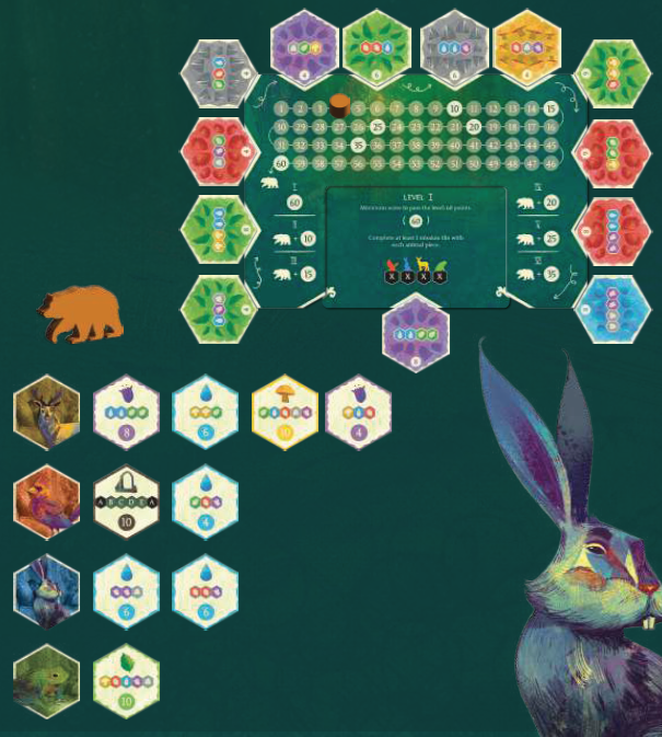 ミッションを1つ完了すると、スコアボード上のソリティアスコアマーカーを前方に移動させることができます。60ポイントに達したら、クマのコマを取り、スコアマーカーを最初に移動します。クマのコマは、60ポイントを達成したことを示すために使用されます。
