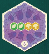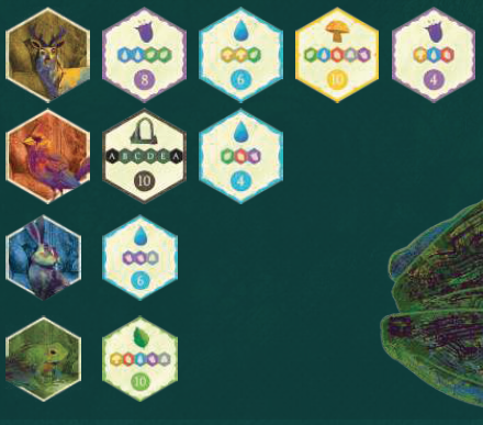 開始タイルを除いて、すべてのタイルは同じ構造です。タイルには6色があり、森の中で見つけることができるさまざまな要素を表しています:果物(赤)、花(紫)、キノコ(黄色)、葉(緑)、水(青)、鉱物(灰色)。