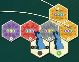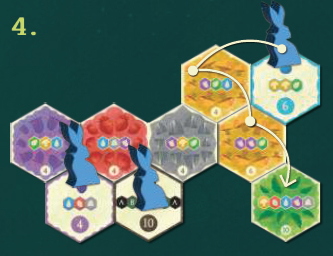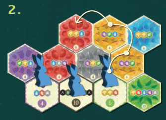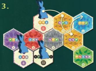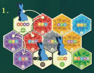 自分のターンに可能な限り何枚でもミッションタイルを完了できます。そのためには、問題の動物コマを、ミッションタイルで指定された色とシーケンスのみを通過するように注意しながら、その場所からパスの終わりまで連続して隣接するタイルを通って移動する必要があります。このシーケンスのルートの形状は自由に選択でき、直線、ジグザグ、さらにはミッションタイルの周りでもかまいません。動物コマを持ってパスを移動させた後、パスを開始したミッションタイルを個人のゲームエリアに配置します。完了すると、ゲーム終了時に指定された勝利ポイントが付与されます。