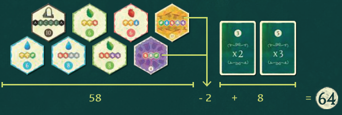 例7: パトリシアは、プレイエリアに次のタイルとカードを置いてゲームを終了します。彼女が満たしたタイルによって、彼女は58ポイントを獲得します。2つのタイルを使ってマーケットを更新したので、2ポイントを失います。さらに、彼女はコンボカードで8ポイントを獲得し、合計64ポイントを獲得します。 58 - 2 + 8 = 64 |