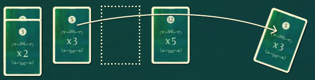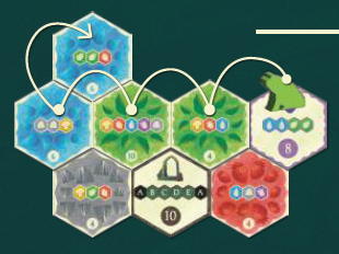 次に、動物がパスを終えたタイルを裏返し、緑-緑-赤のシーケンスがその動物コマの新しい目標になることを示します。 |