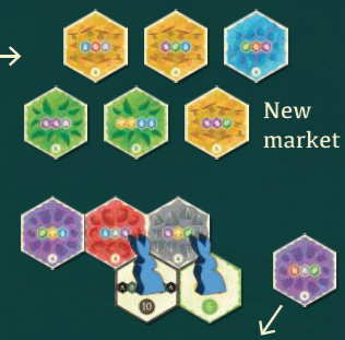 例 1: パトリシアは以前に完了したミッションタイルを1つ持っており、それを裏返してマーケットを更新することにしました。 |