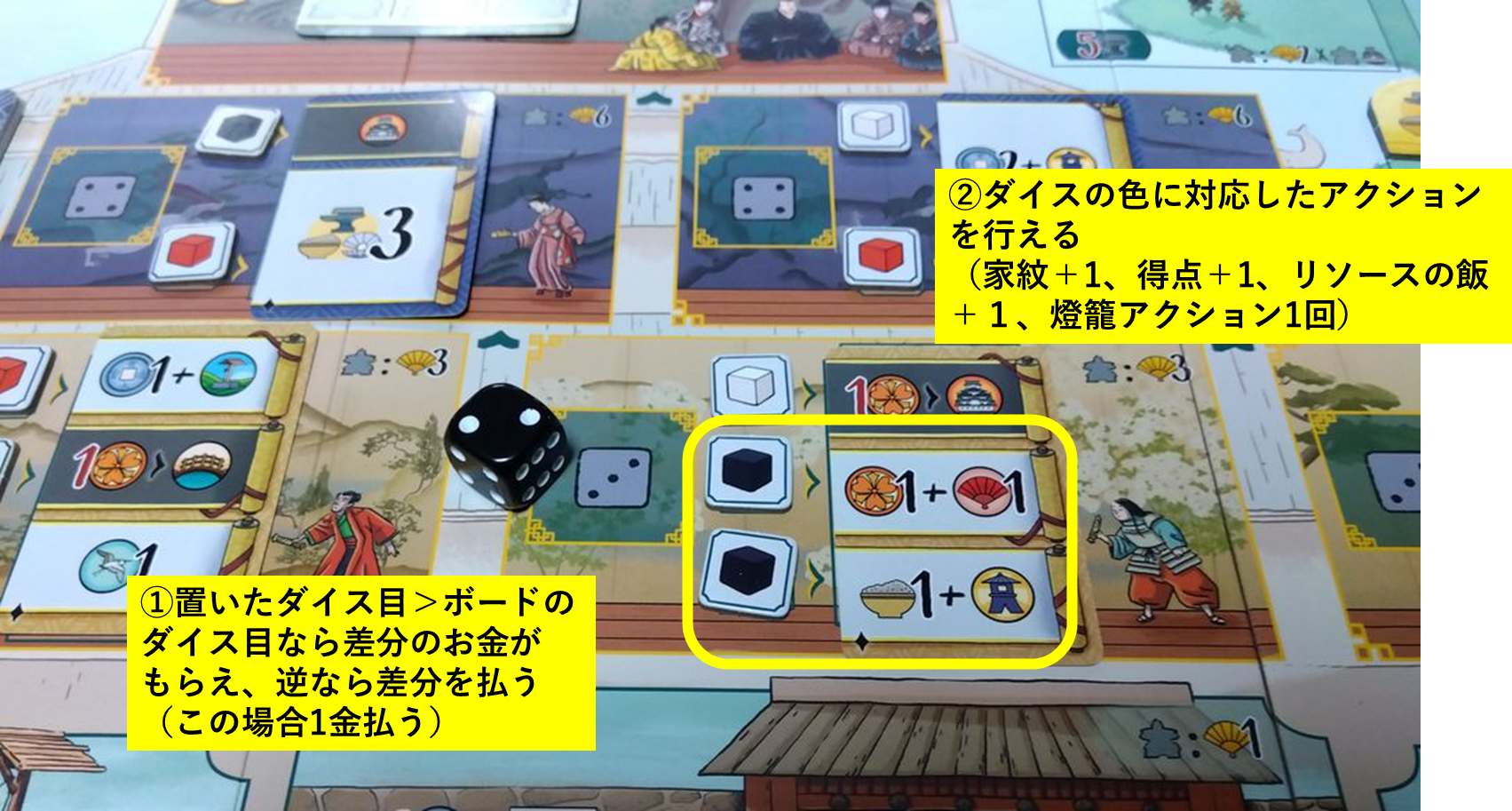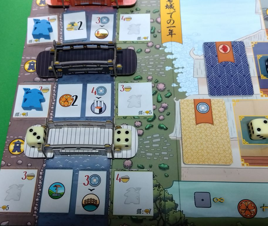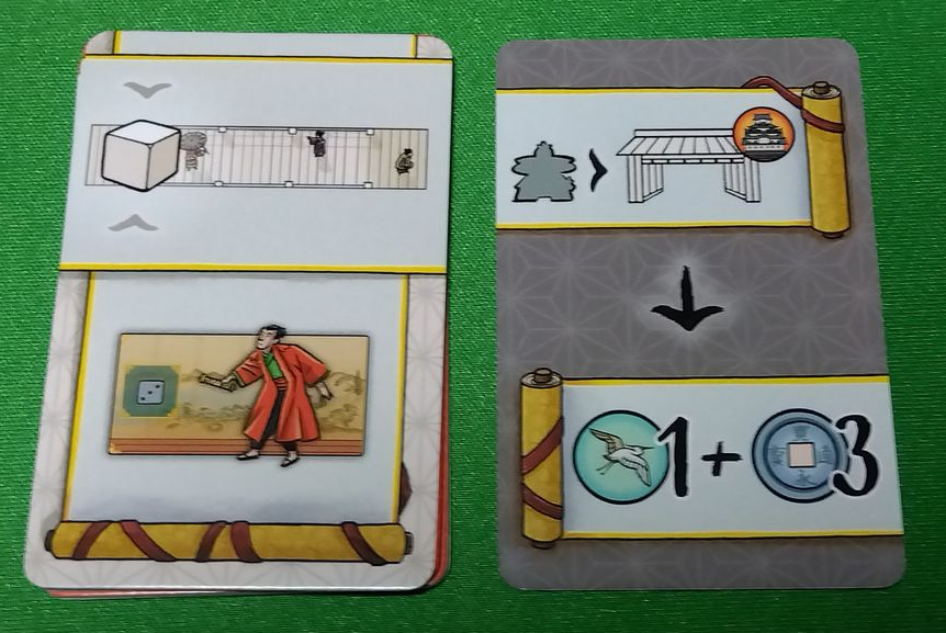 例:このカードの並びだと、左のカードで「白の左ダイス」を「該当するところ(城内1段階目)」に置きます。そして右のカードで「藩士を1人城門に配置」して「二十四節季+1、3円獲得」というアクションになります。