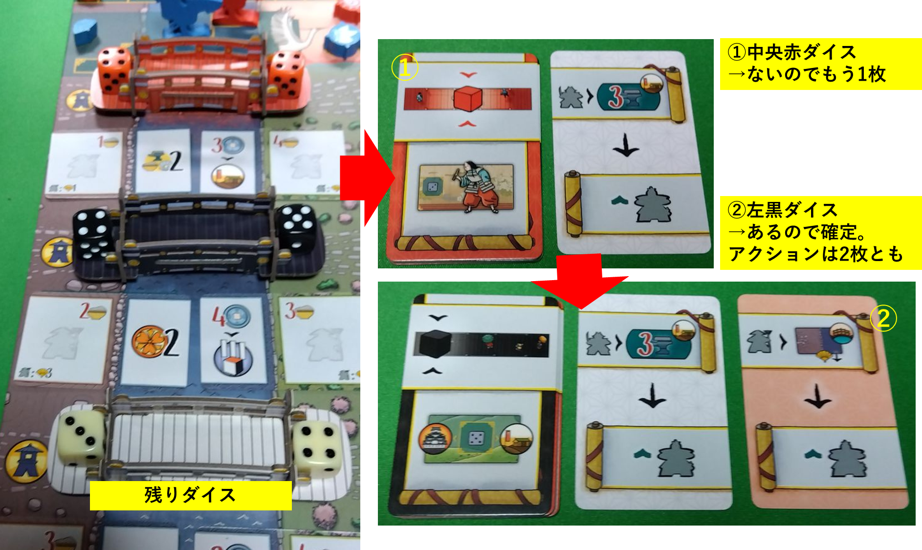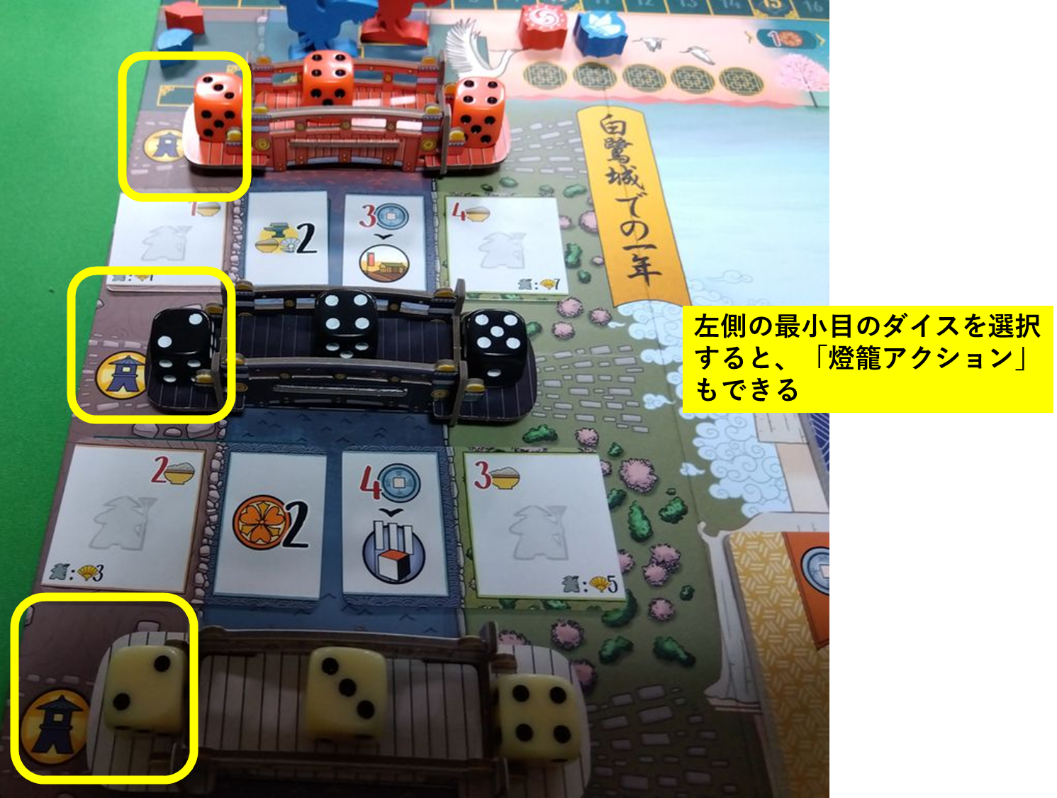 ①ダイスを選択(橋内の最小の目であれば「燈籠アクション」実行)