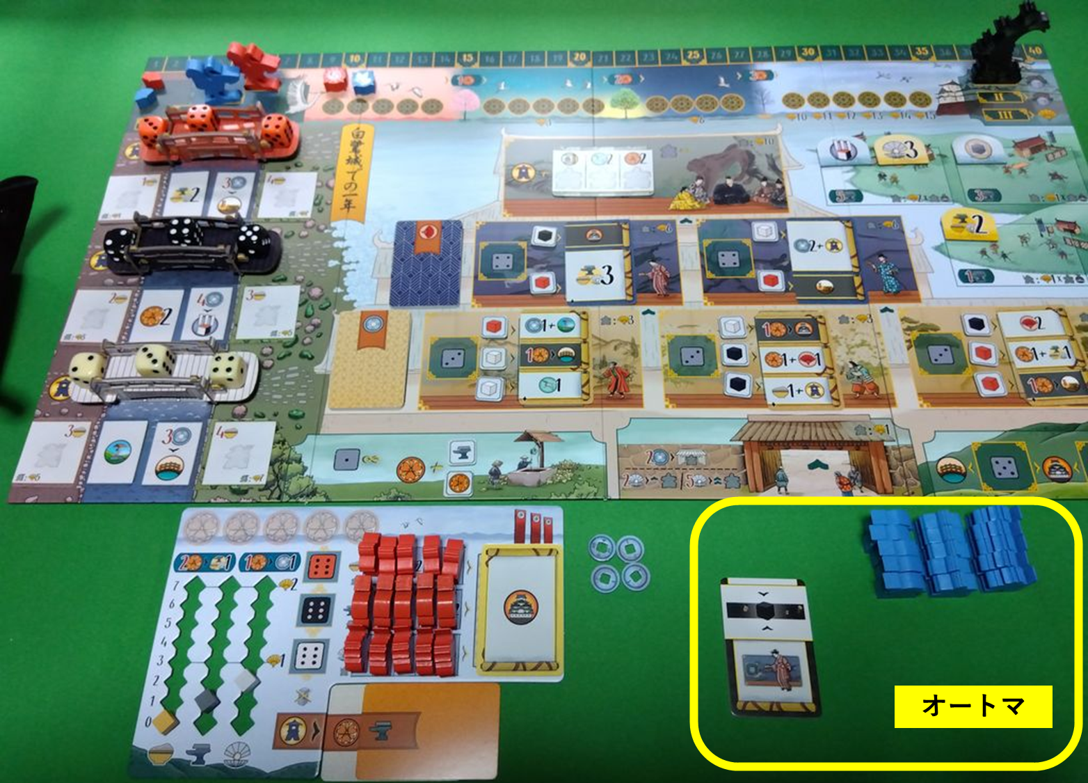 セットアップは2人用準拠。ただしオートマはボードをもたずリソースもお金以外得ないので、各種ワーカーとお金が置けるエリアを作ってやればOK。