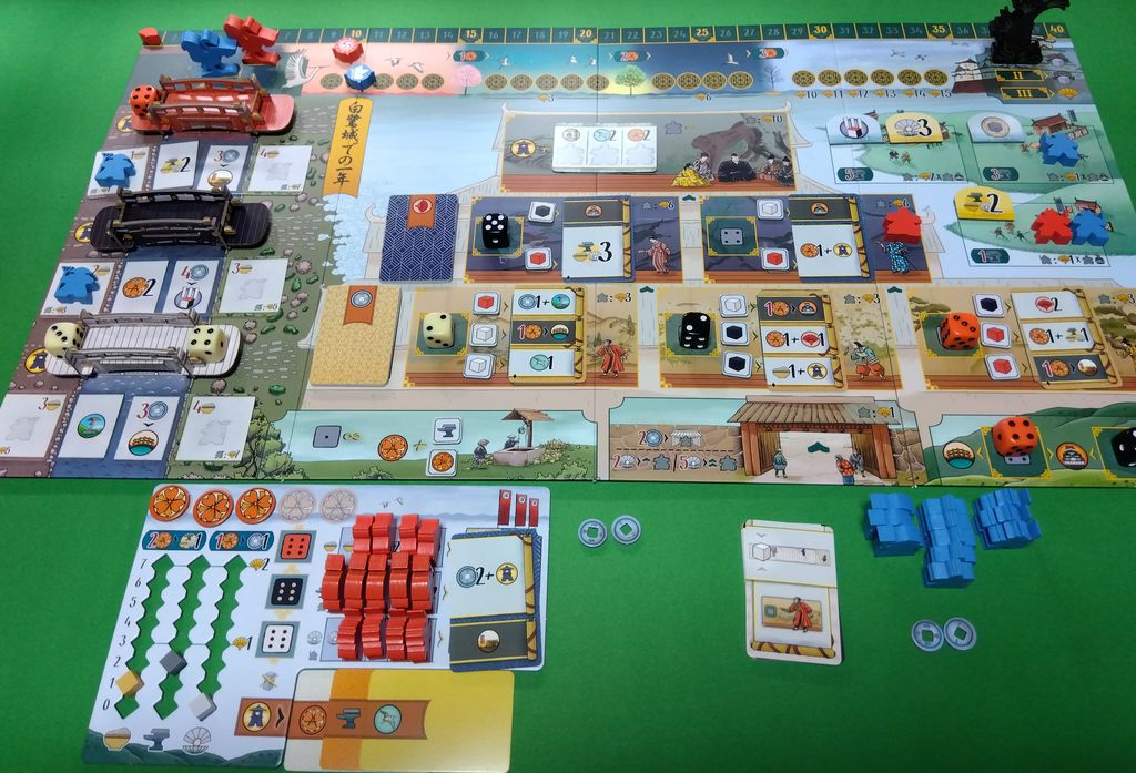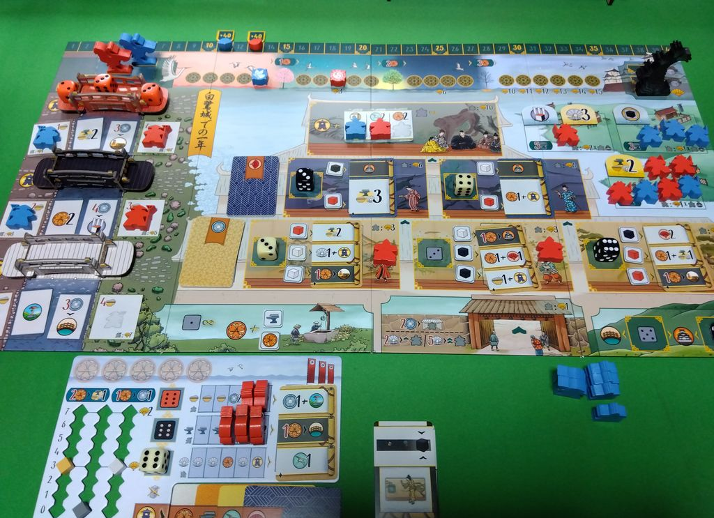 ・直接点が得られるアクションもあれば終了時に得点になるもの(場内の藩士×武士等ミープル配置数やスタP争いにもなる二十四節季トラックの位置等)もある。それらを終了時に積み上げて点の高い方が勝ち。