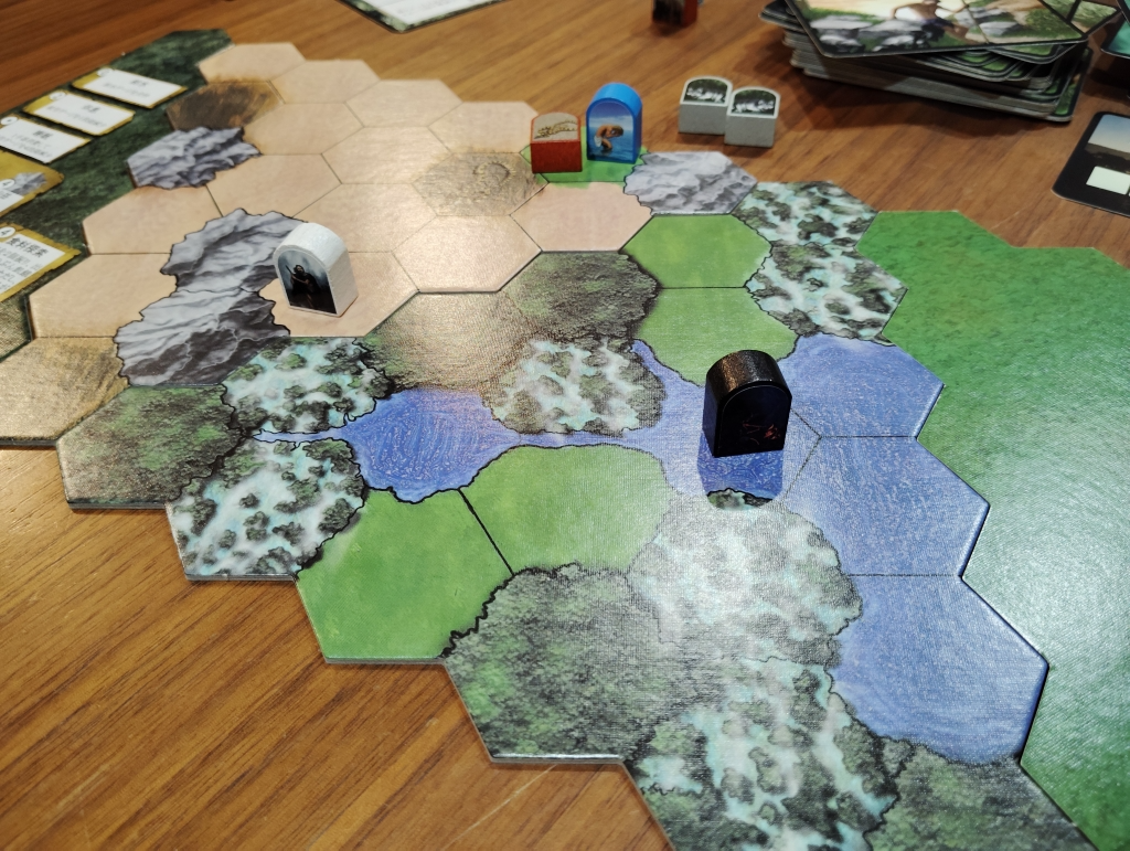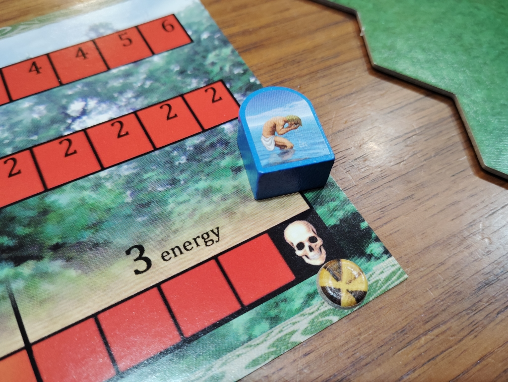 食糧探索で体力ゲージを回復することもできますが、ダイスロールの出目次第では何も得られず日が沈んで手番が終わることもあります。
