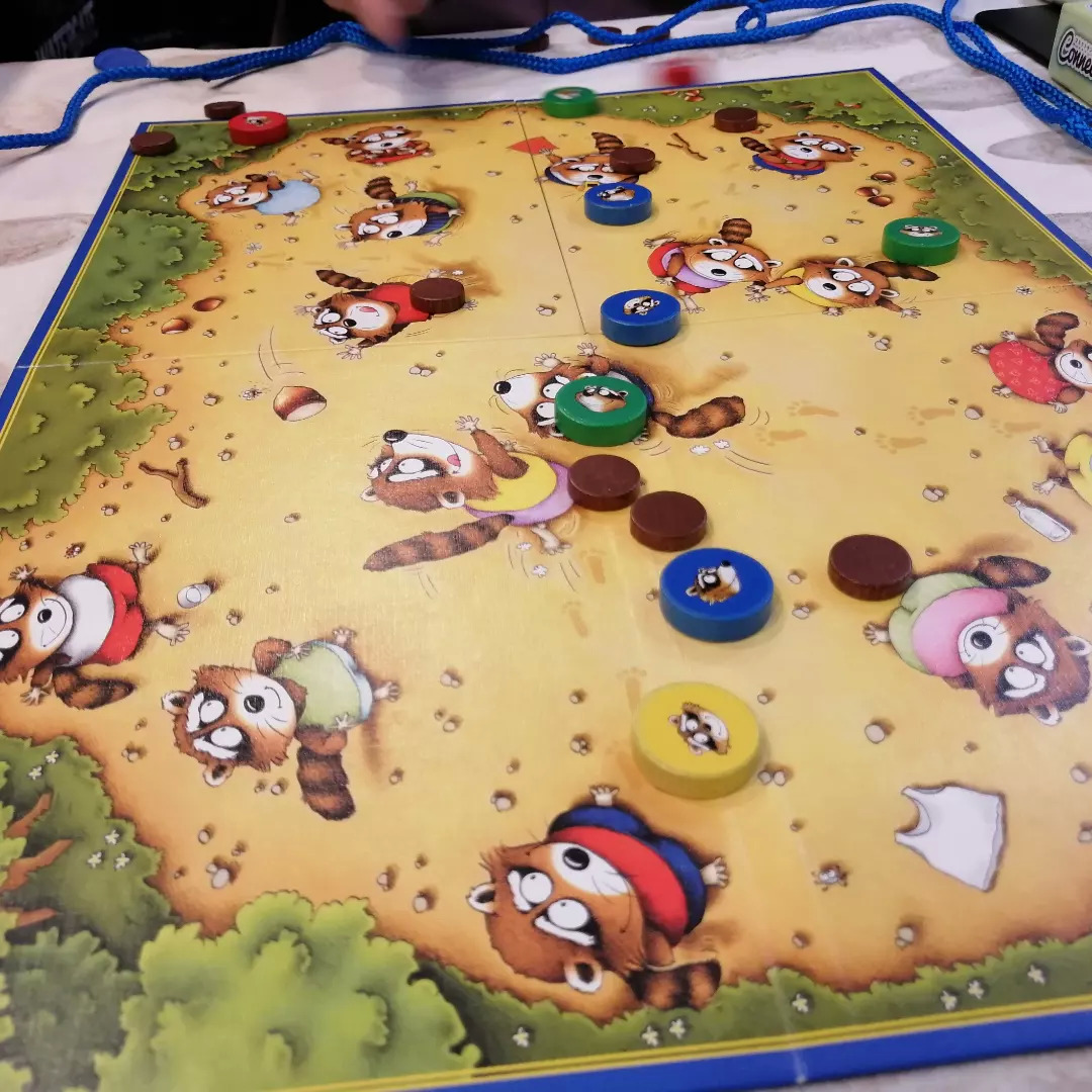 好きなアライグマを弾いて木の実かアライグマを落とす。すべての木の実が落ちるか他プレイヤーの隠匿アライグマを3匹始末するかすればゲーム終了。