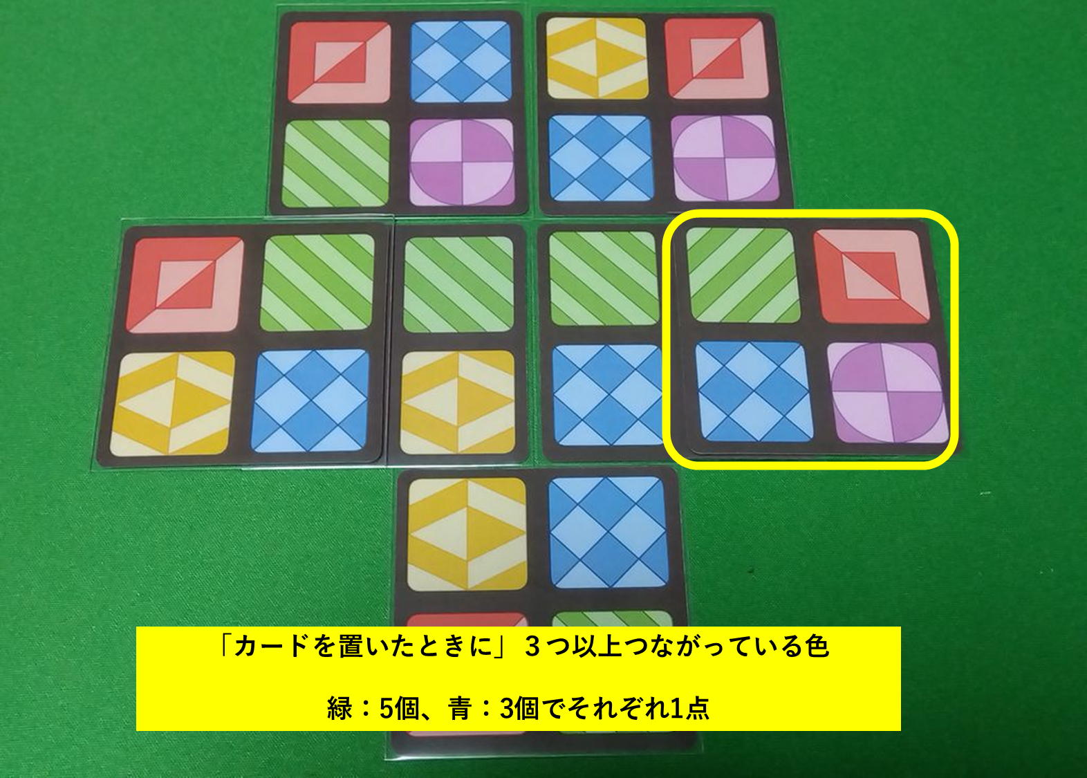 ①カードを置くごとに「同色3個以上繋がっていれば1点」加算されます。1枚のカードが4色なので最高で1手番4点獲得可能。