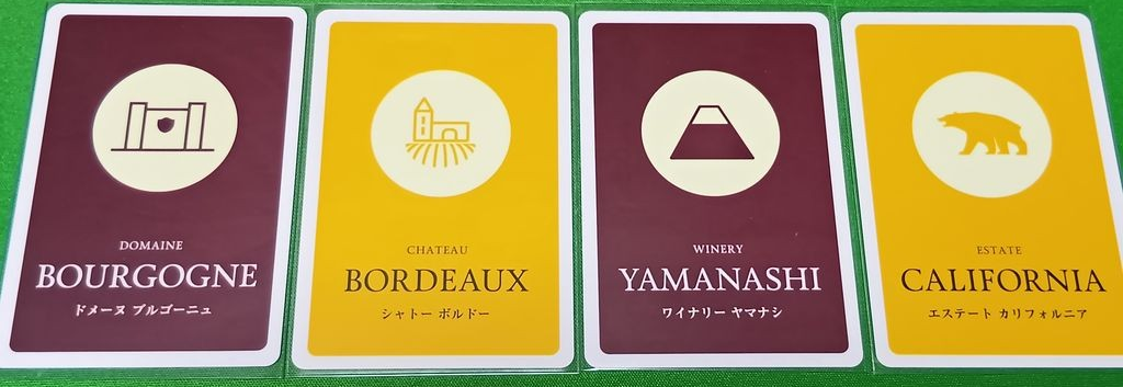 このほか、評価カード4枚が同色の加算ボーナス、投資カード3枚で1ワイナリーを独占したとき得点を倍にするボーナスがあります。ただし評価点がマイナスになる場合もあり。