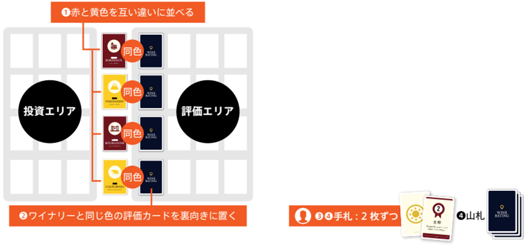 プレイヤーはワインの品評家&投資家として、4つのワイナリーに投資や評価を行っていきます。より多くの投資を行ったプレイヤーがそのワイナリーの受ける評価=得点を獲得することができます。