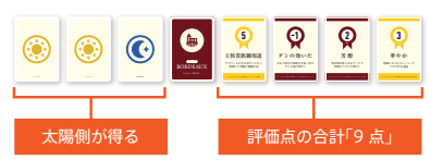 これを繰り返し、投資エリアに12枚・評価エリアに表向きの12枚がプレイされたらゲーム終了。