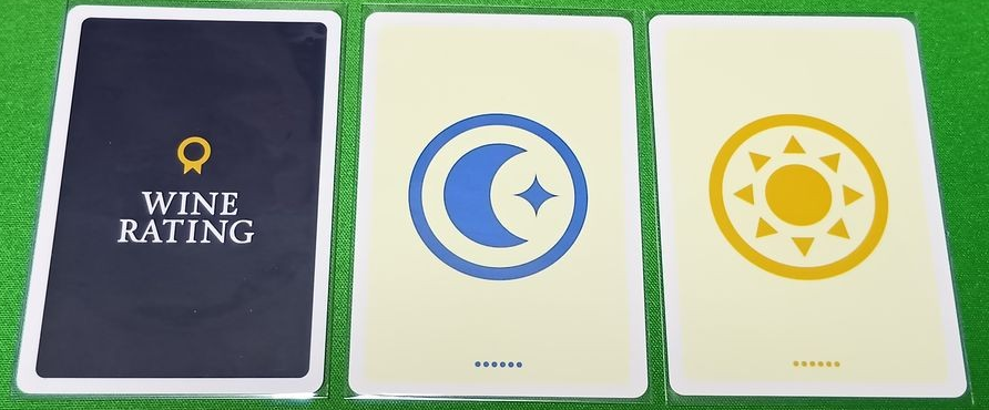 〇評価カード:評価エリアにのみプレイ可能。各ワイナリーに初期配置で1枚ずつ裏向きに置かれているものと別に3枚ずつ配置可能。これは評価点とフレーバーテキスト。よくあるワイン評価的なやつです。