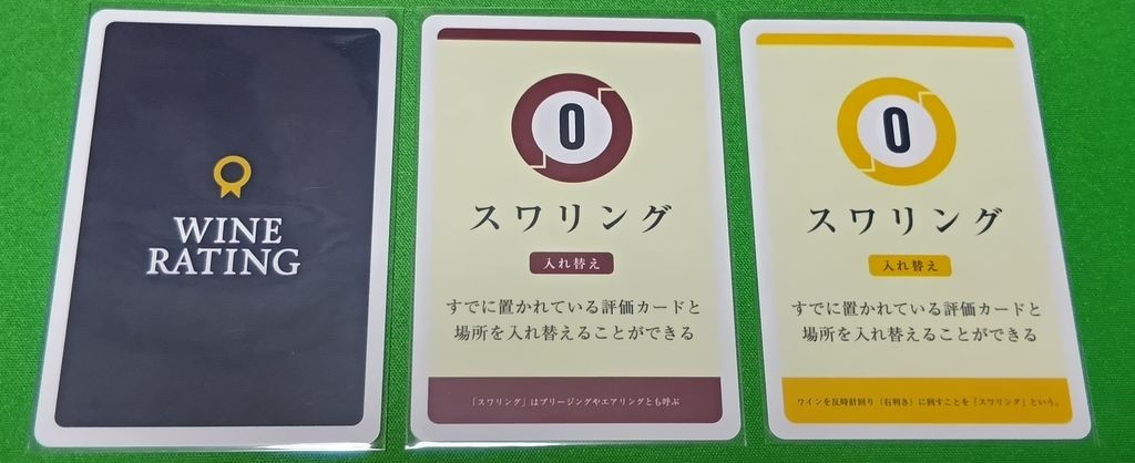 〇特殊カード「スワリング」:評価カードに含まれます。プレイ時に任意でこのカードと場に置かれた評価カード(裏向きも可)を入れ替えることが可能(任意)