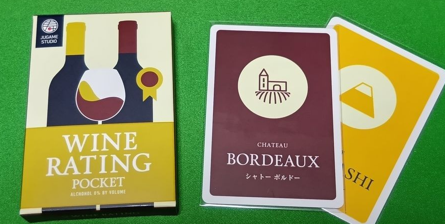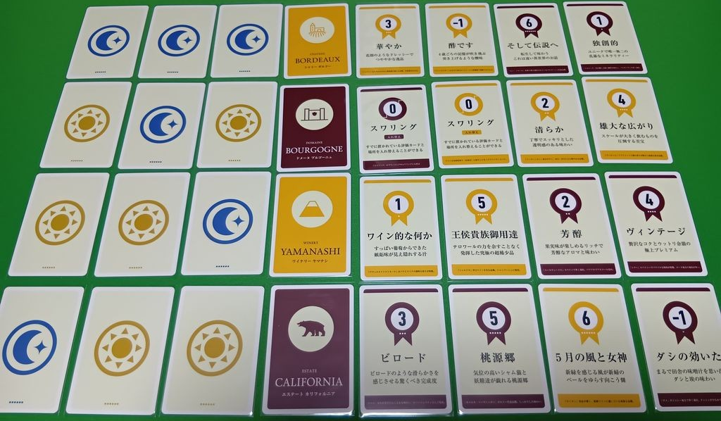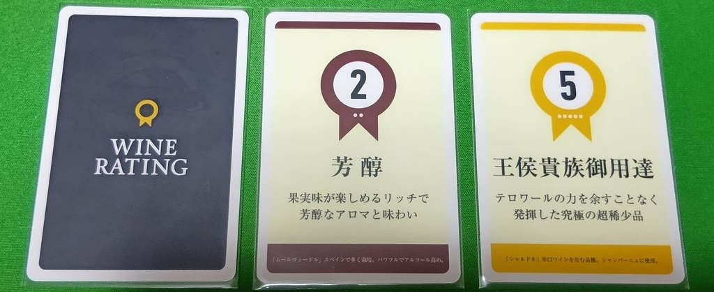 コンポーネント:カードデザインはいつも通りシンプルかつお洒落。ワイン要素が絵で確認できるのは箱絵だけですが、投資と評価がテーマなので、このくらいの方が見やすくていいと思う。個人的に評価カードのアロマテキスト(フレーバーテキスト)が結構ツボです。