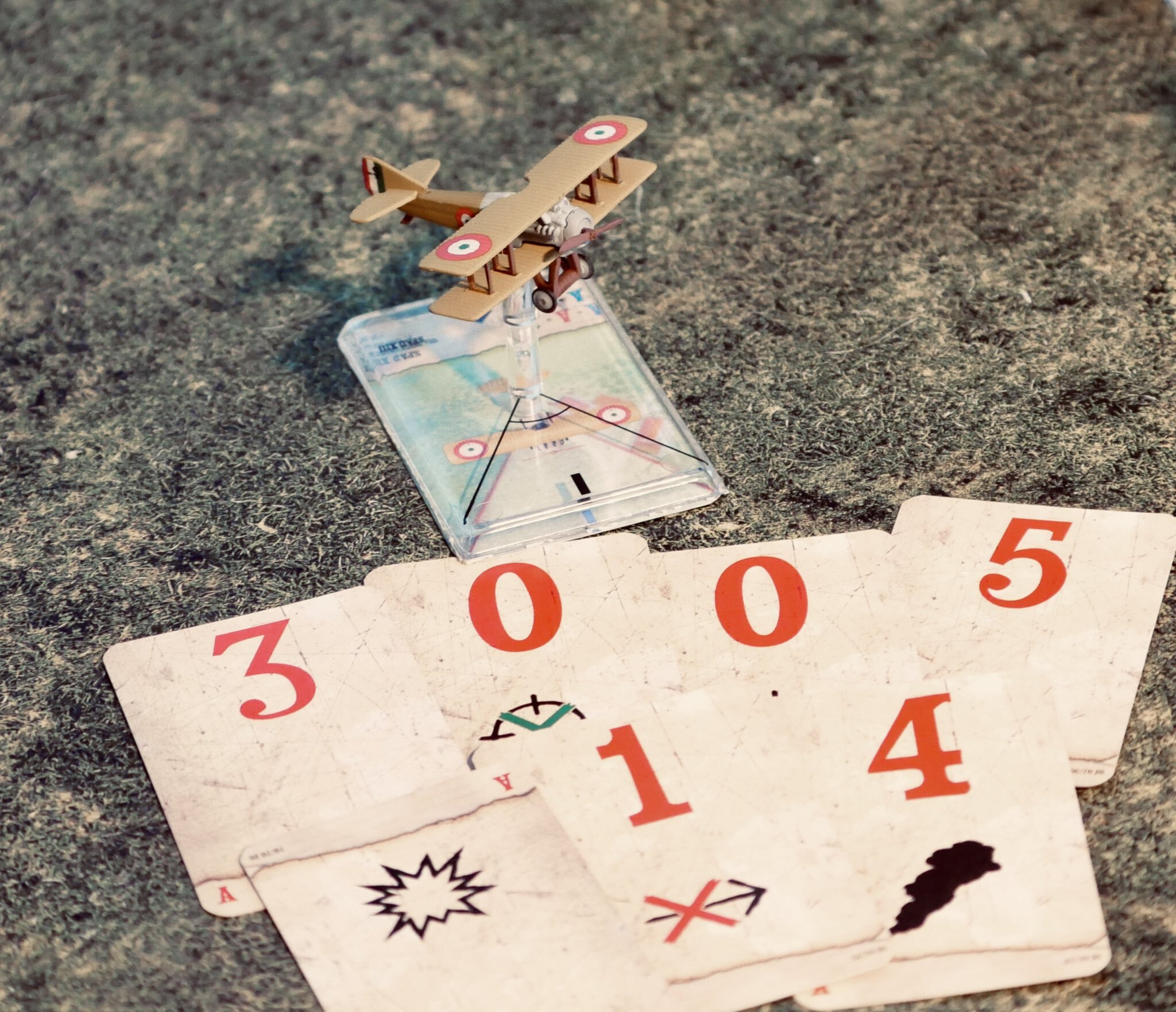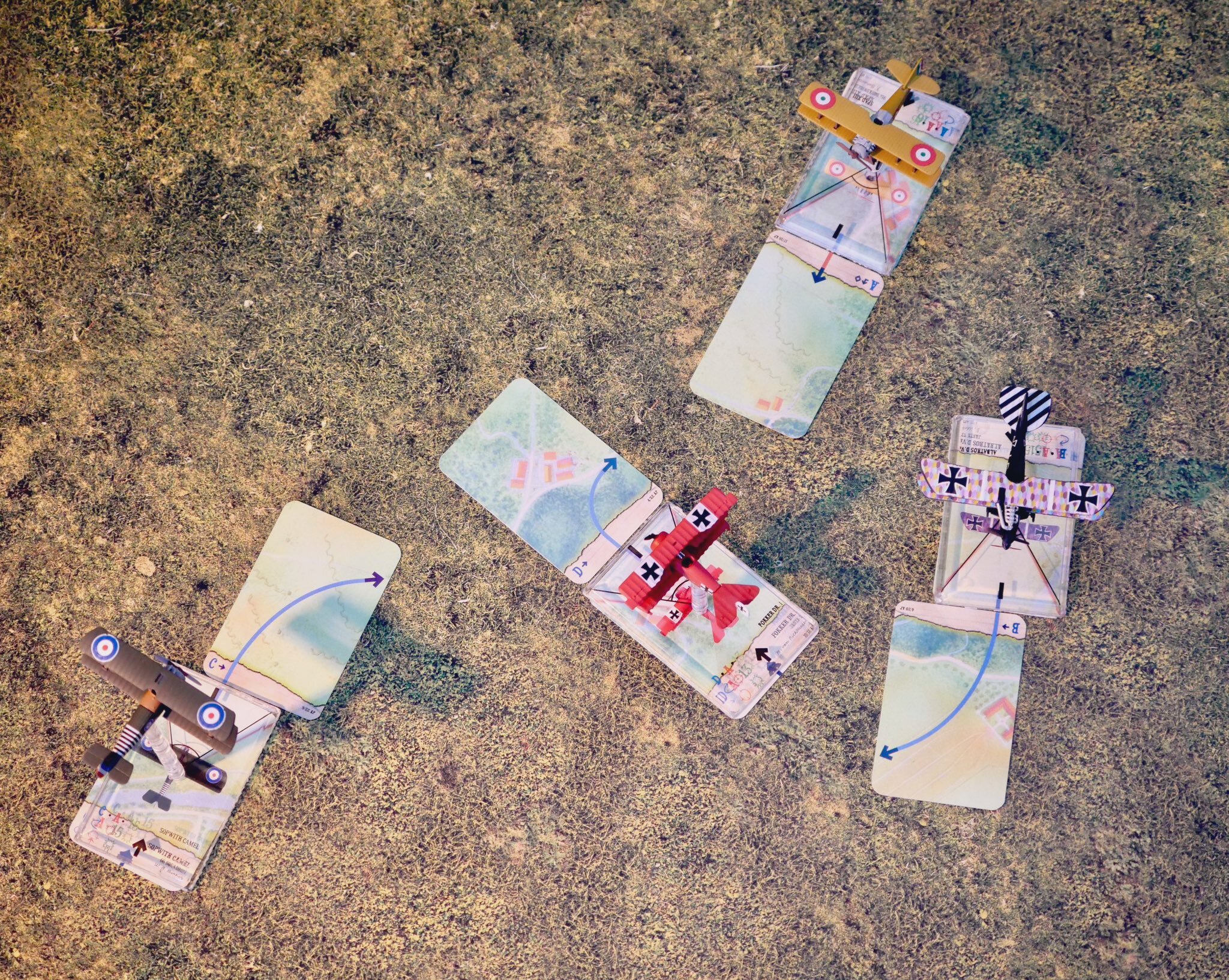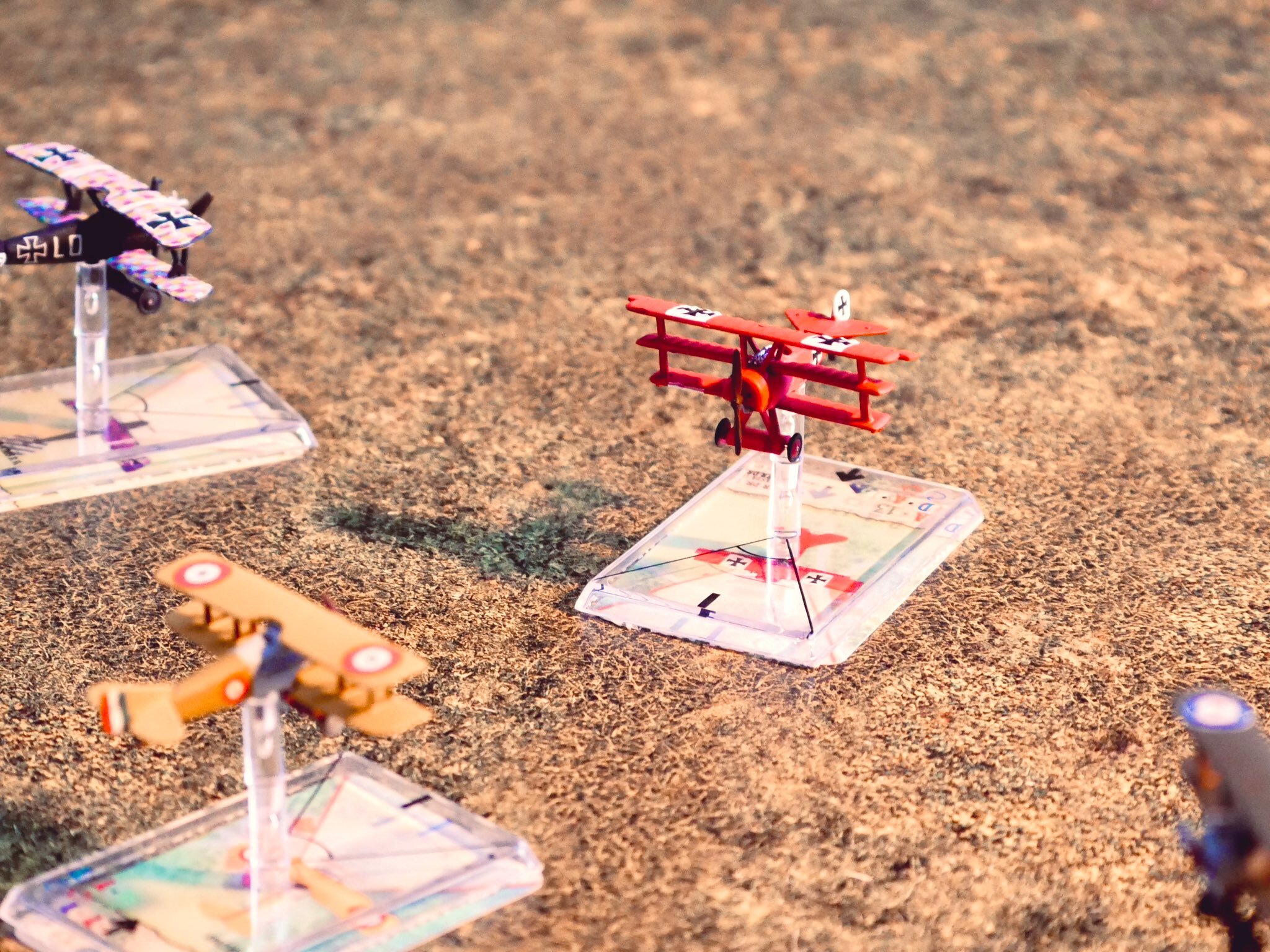 塗装されたミニチュアの複葉機が臨場感抜群で、ボードゲームと言うよりはアナログゲーム的な遊びができる玩具といったところ。