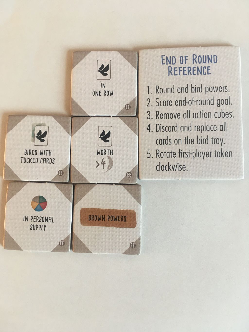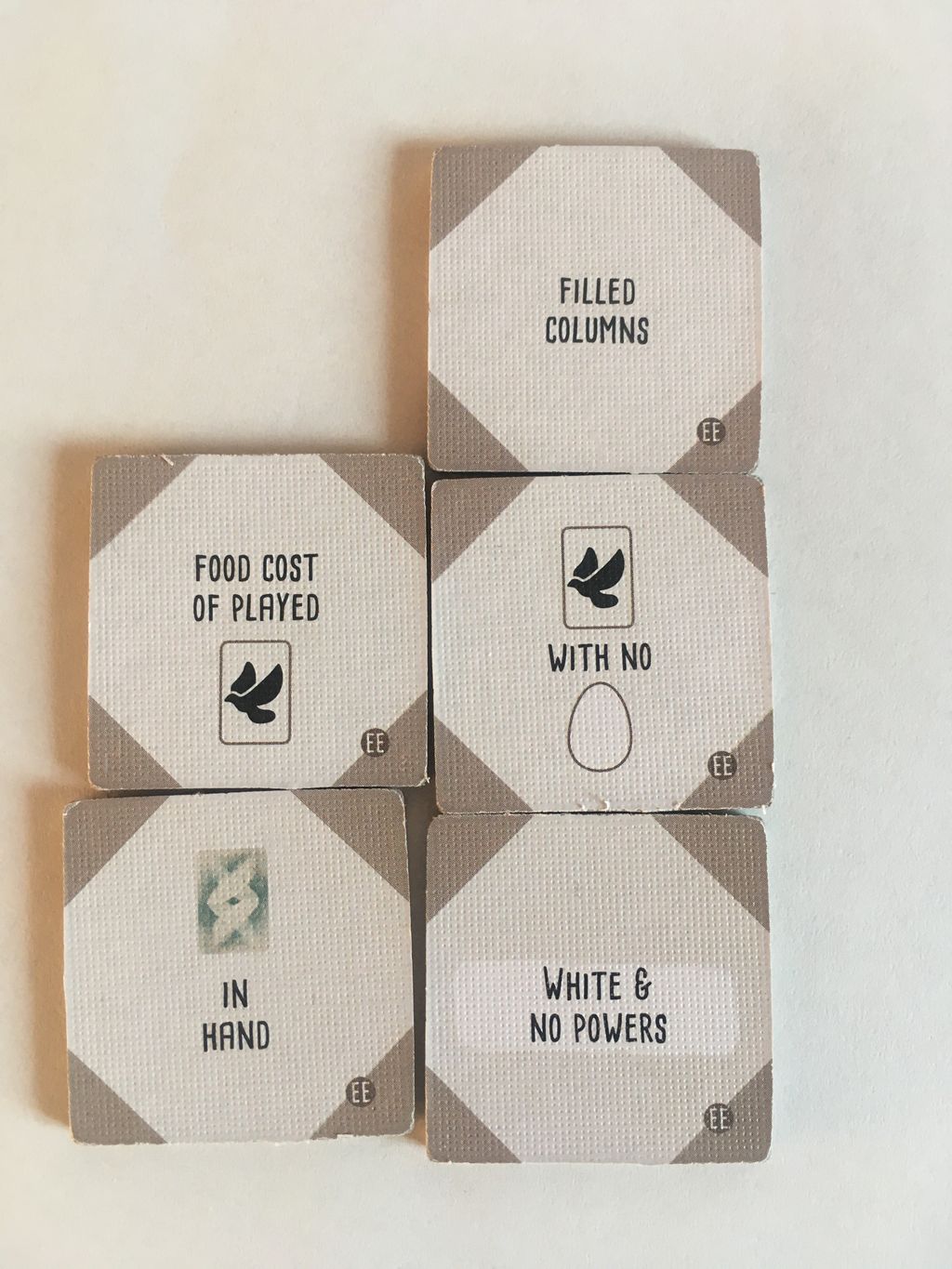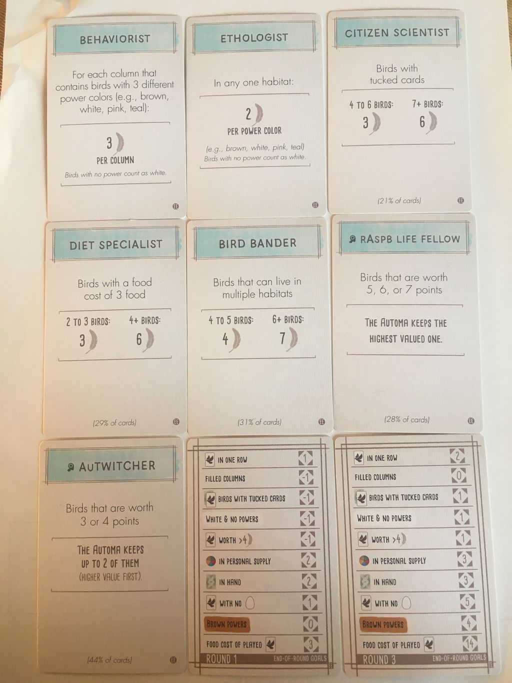 目的タイルは、写真に載せました(1.獲得、2.勝利点4以下、3.行の最大値、4.餌トークン、5.茶色い能力、6.餌の総コスト、7.卵のない鳥、8.満たした列、9.手札、10.白カード&能力なし)どれも面白そうな能力で、ゲームの行方が分からなくなる補正がかかっている気がします。