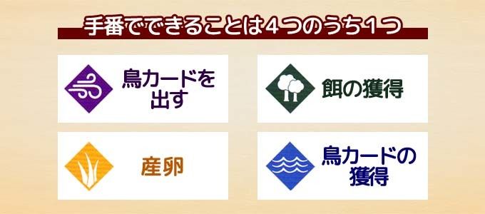 手番では「4つのアクションのうち1つを実行する」だけなので、遊び方はかなりシンプルです。