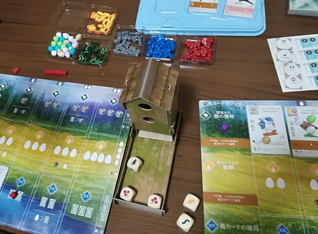 ダイスタワー、卵トークン、鳥カード、サイコロ1つとっても、それぞれがいちいちかわいくて見て触ってるだけで幸せな気分になってきます。