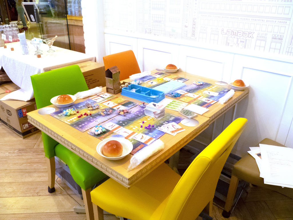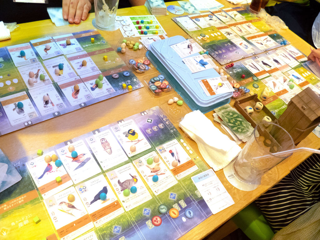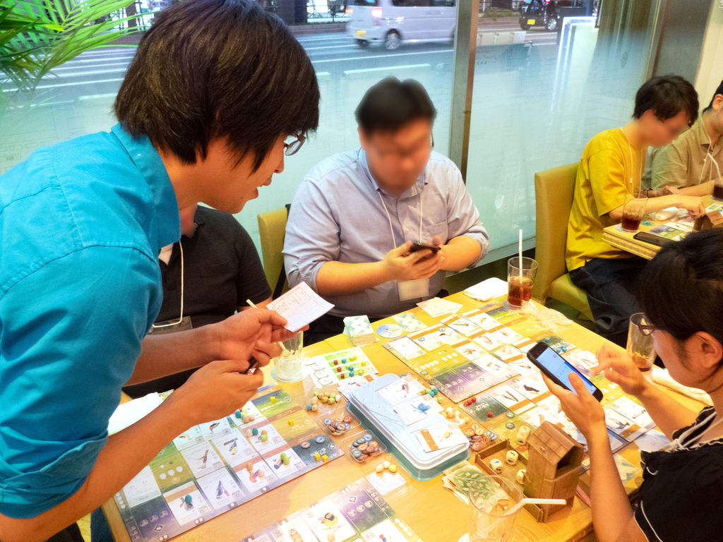 そういえば、各卓に1~2名ずつ、ウイングスパンの経験者がいたようです。日本語版発売前なのに、なかなかの猛者が揃っていますね。私も1回遊んだことはありましたが、ほとんどルールを忘れていました。