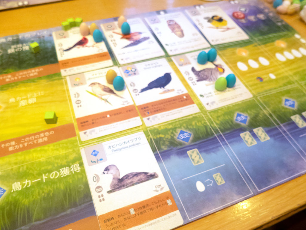 ウイングスパンは、鳥の絵が全カードで違うのと、このカラフルな卵が素晴らしいですよねー。図鑑的な説明もあるので、飽きません。プレイ中は次の手番を考えるのでいっぱいいっぱい……、いや、けっこう読んじゃってた気がします。