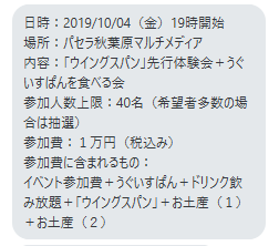 ある日、アークライトさんのラインから、とある案内が送られて来ました。「ウイングスパン」選考体験会+うぐいすぱんを食べる会!なにやらうぐいすぱんだけでなく、お土産もあるとのこと。
