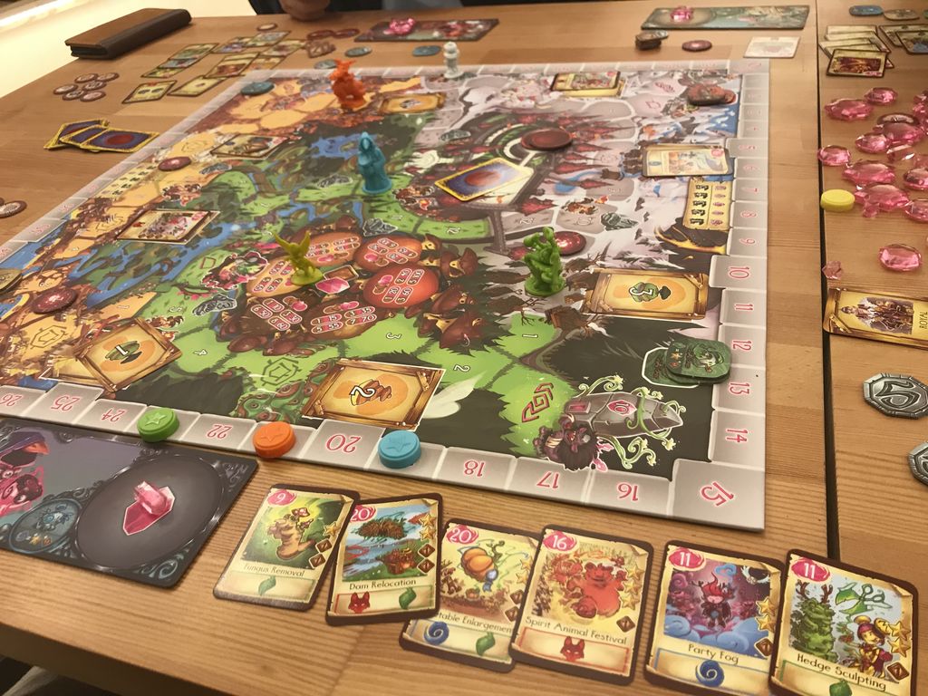 各プレイヤーは魔法使いの弟子です。このキノコ王国で仕事をクリアして、勝利点やお金を手に入れては魔力を貯めて新たな仕事をクリアしていく流れになります。ただ、仕事をしに行くにあたってその場所に向かう必要があるので、その兼ね合いで他プレイヤーの位置を確認して競争する兼ね合いができます。